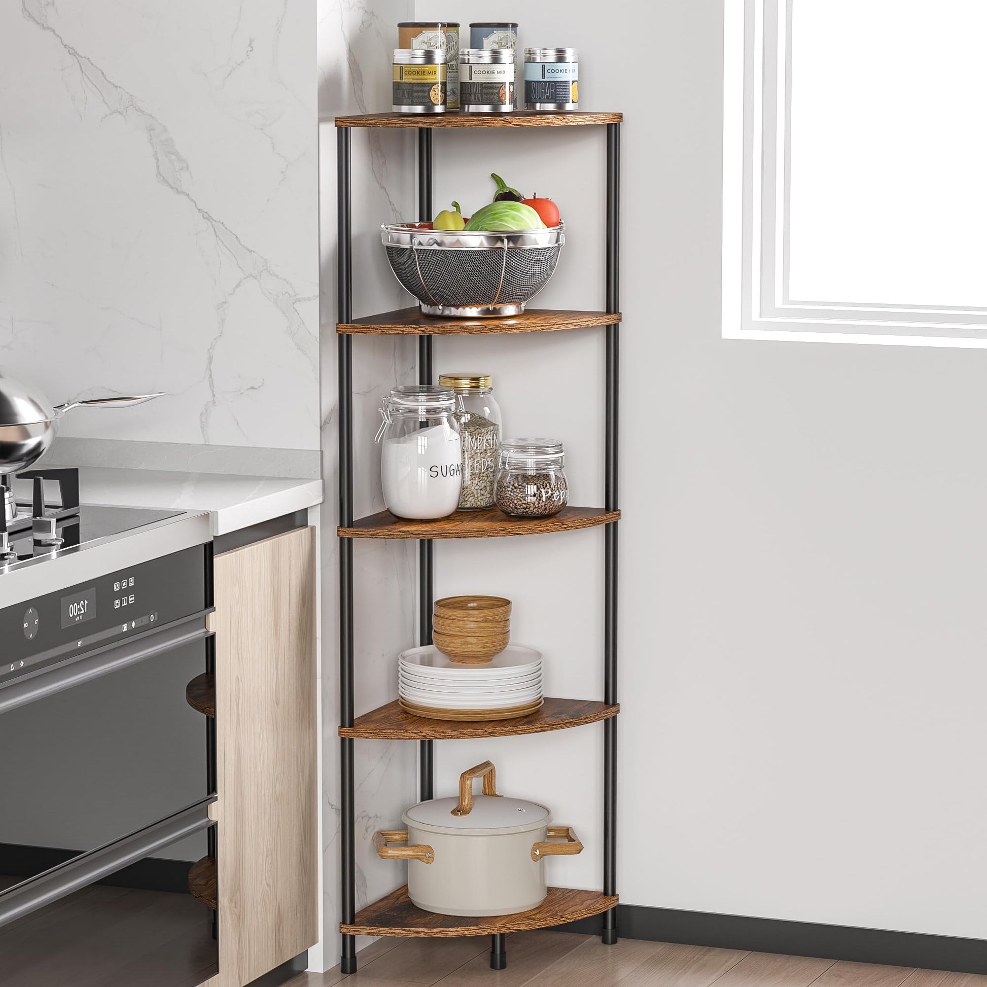 - Stylish & Functional 5-Tier Corner Shelf: The height of the corner shelf stand is 44 1/8", the shelf radius is 11 3/8", and the space between each shelves is 9 13/16". This kitchen shelf organizer provided plenty of vertical storage in kitchen without taking up much precious floor space. The five tiers give lots of room for oil bottles, blenders, spice jars, canned food, salt and pepper grinder, pots and pans, etc. Achieve a clean and orderly kitchen with Greatseas kitchen organization and storage rack
