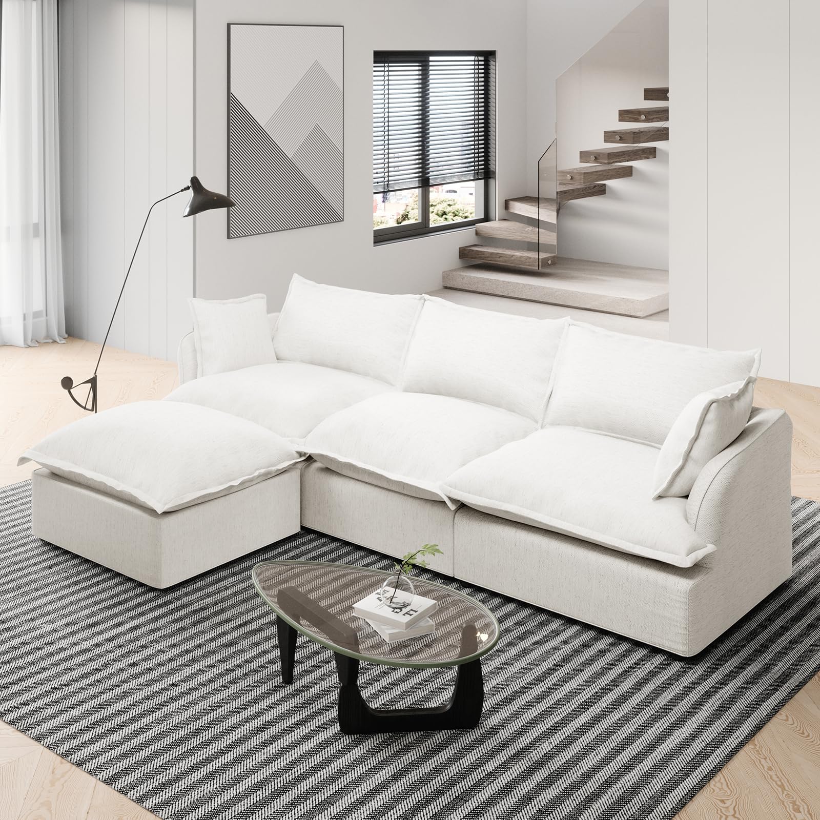 - Made of soft linen blended upholstered, featuring comfortable down cushions and high-quality sponge filling, this cozy oversized sectional couch offers you comfort, like sitting on a cloud. Besides, featuring 26.8 inches deep seat, lounging on the sofa when watching a movie or after a long day for ultra comfort.