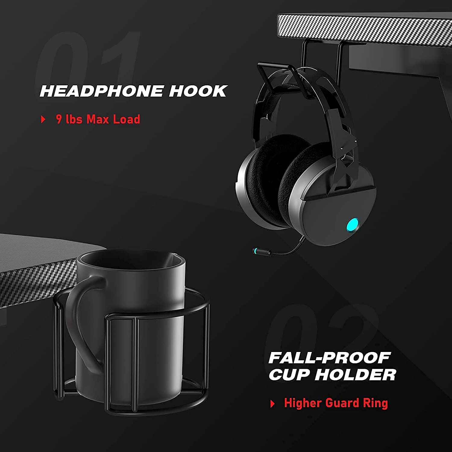 - Multifunction With hook, cup holder, cable manage tray and two speaker/CD holders. You can put books,pens,PS4,etc. on the speaker holders. The cup holder can prevent your desktop from being wet by water. The cable manage tray on back side can fix your socket and cables, avoid entanglement of wires and keep your desk tidy. The gaming desk is also equipped with LED strip lights, with a length of up to 3 meters, which can create a good game and working atmosphere for you.