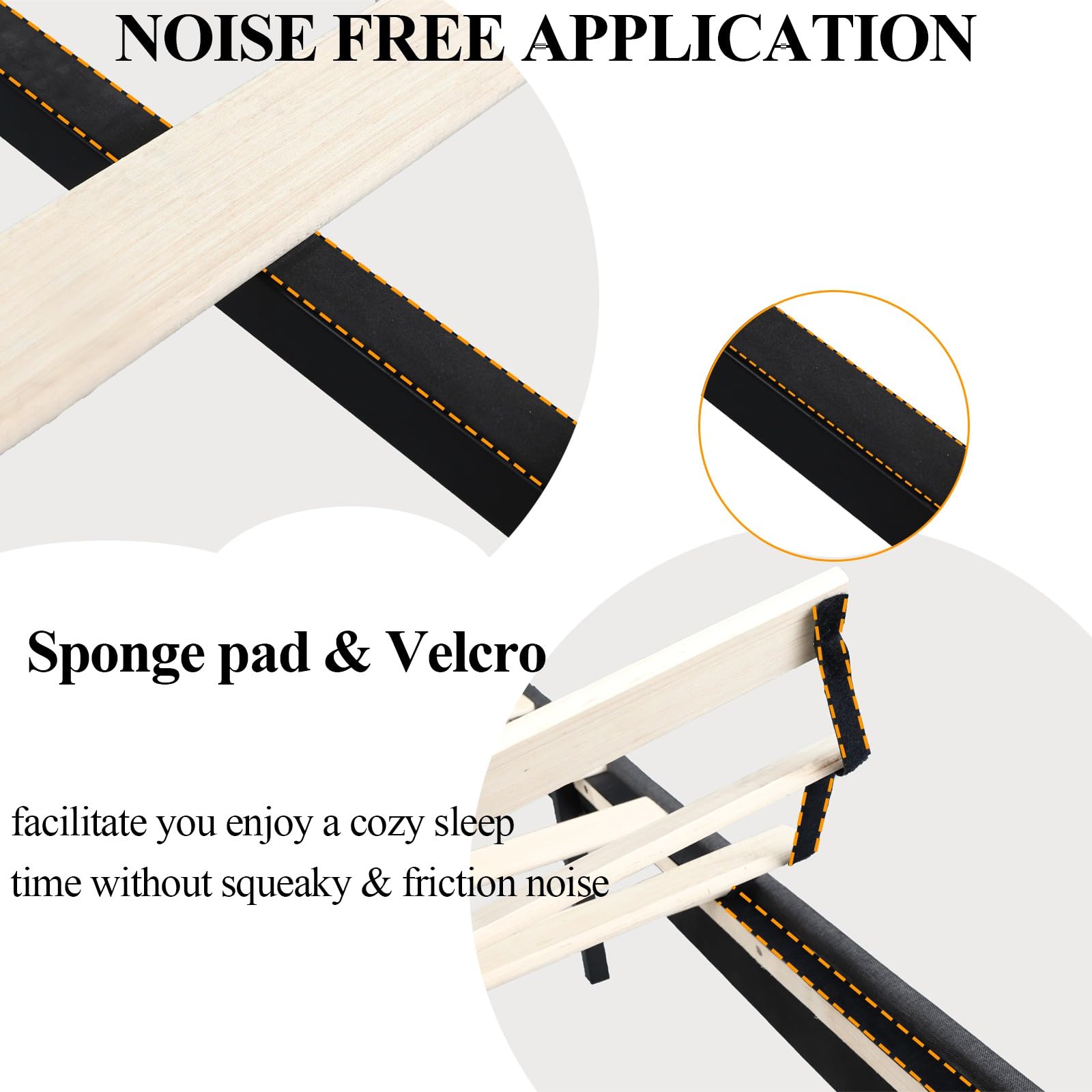 - Upholstered Bed Frame with Noise-FreeCrafted with comfort and stability in mind, its showcase a upholstered headboard and silhouette in premium linen fabric and filled with dense foam padding gives you comfortable touch. Sponge pad and Velcro can fix 12 solid wood slats more firmly and reduce the friction from the steel frame without squeaky and cracking noise.