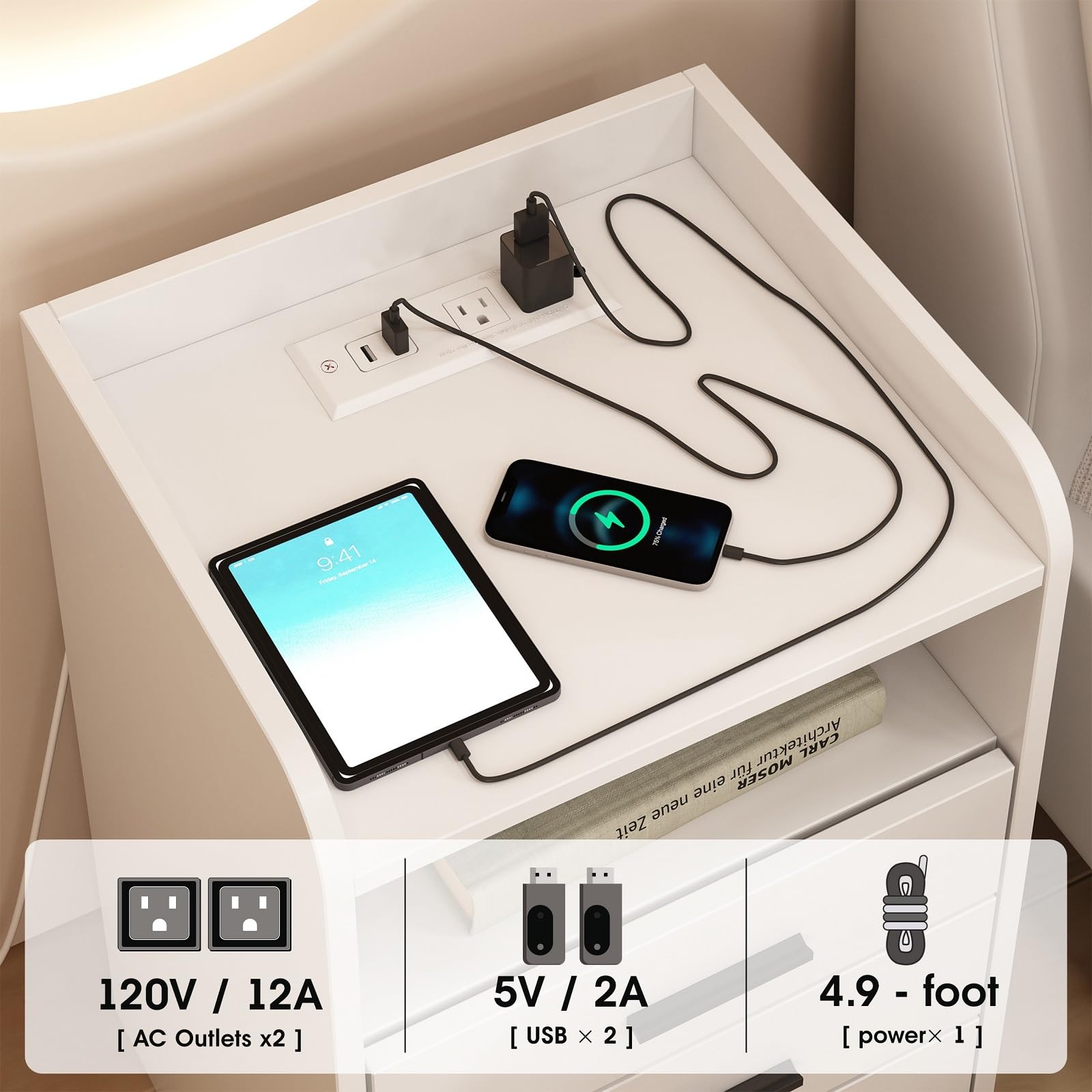 Multi-Functional White Nightstand Set of 2 with Charging Station