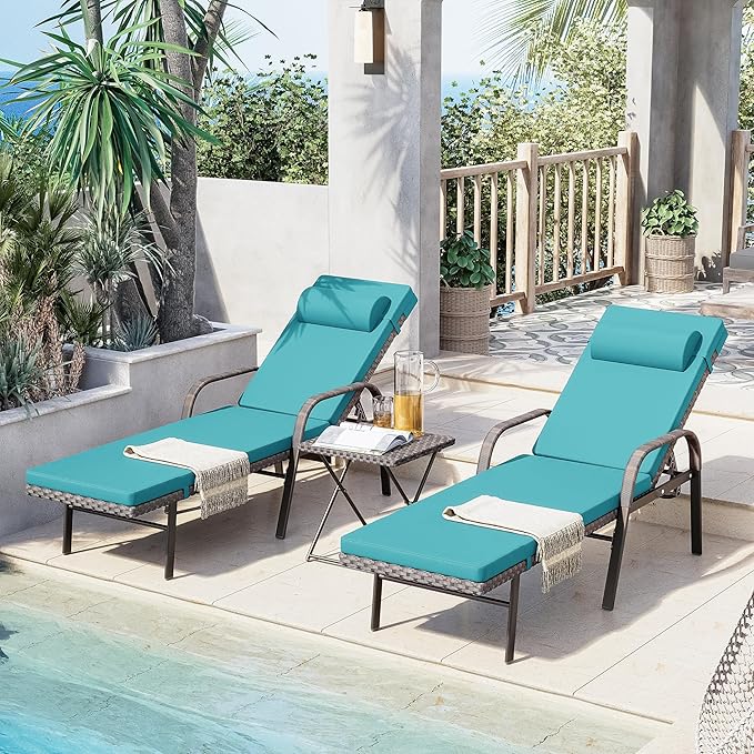 - Sturdy & durable:The lounge chair 3-piece set includes two recliners and a foldable coffee table,the coffee table is perfectly sized to meet the need of shelving while resting. The chaise lounge chairs are made of galvanized metal frame with a weight capacity of 330 pounds, the recliner beds are 79 inches long and 24.2 inches wide, which can meet most people's needs. The rattan is splash-proof and UV resistant, flexible, not easy to break, and fade-resistant, which ensures the recliner can be used for a longer time.