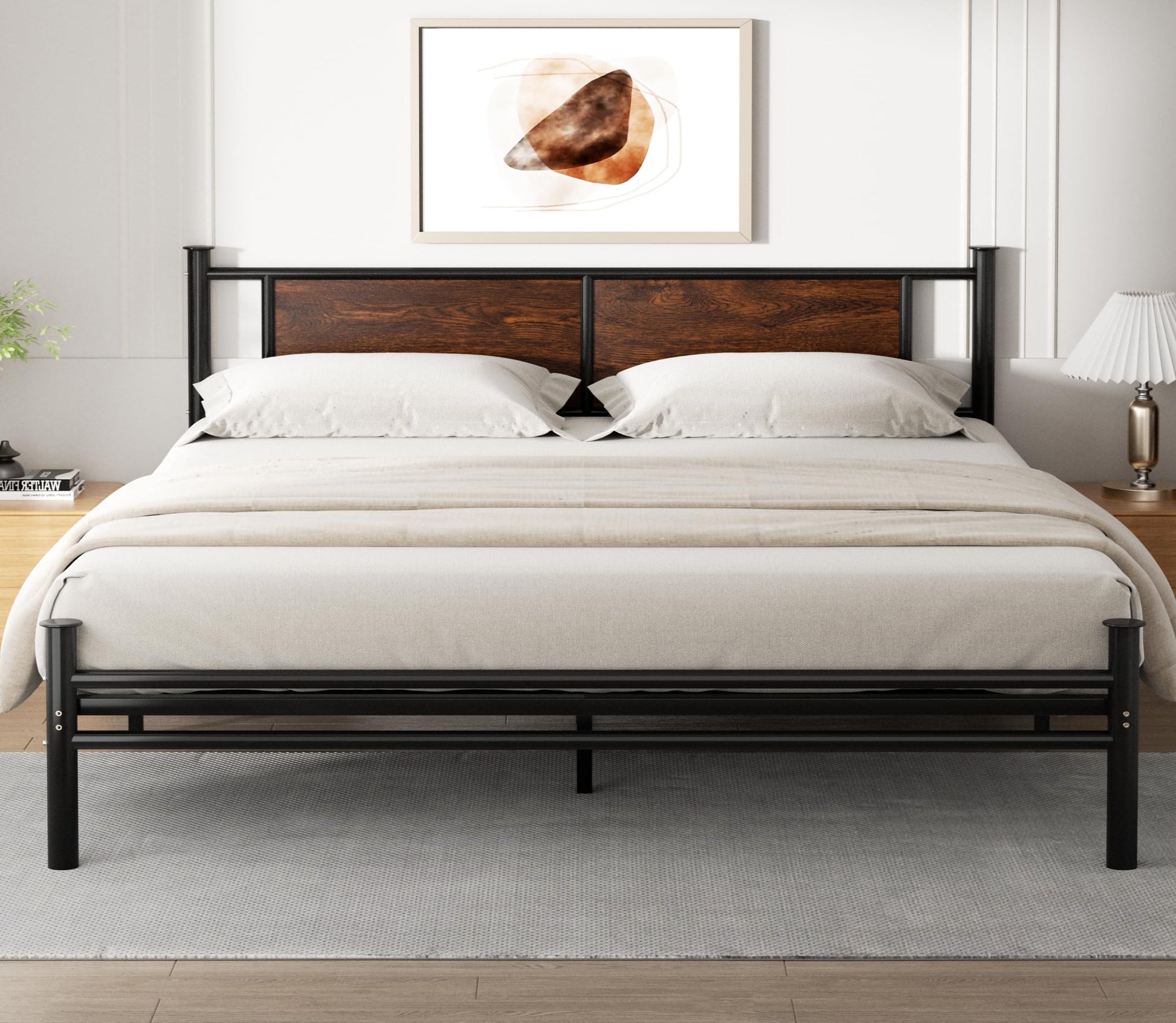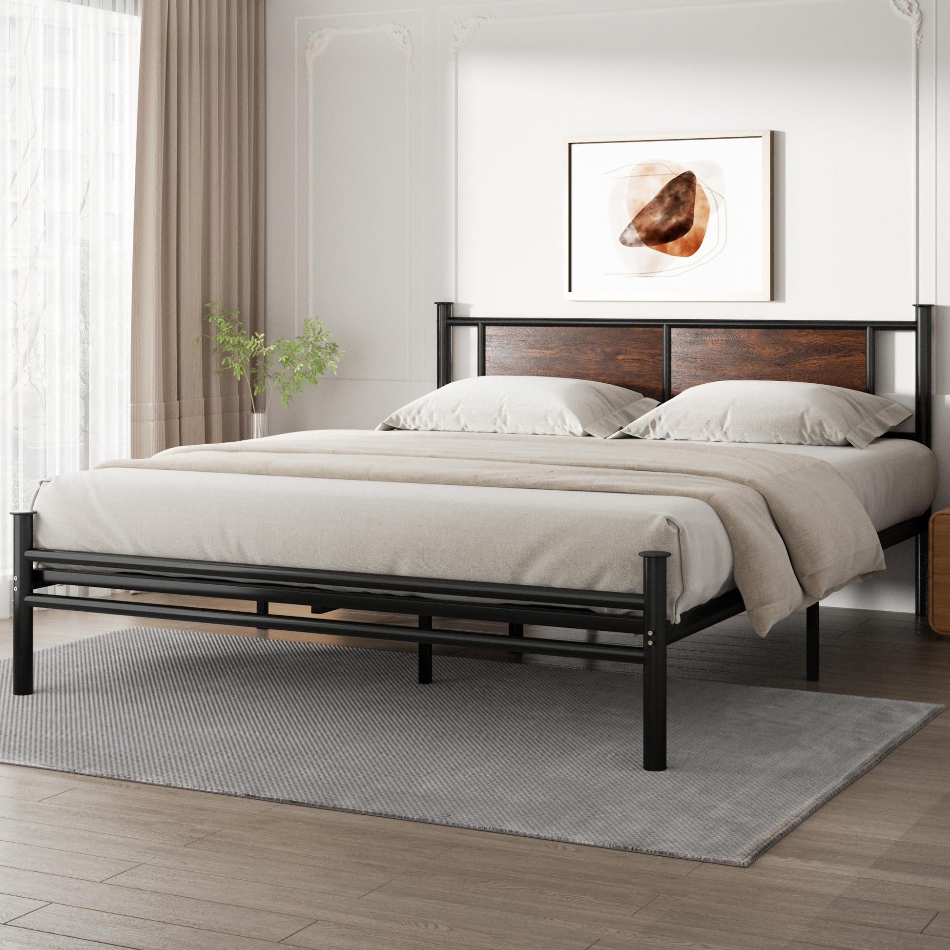 - The sleek wooden grain headboard meets a simple black metal platform frame, creating a captivating modern rustic flair that infuses your room with a distinctive character.