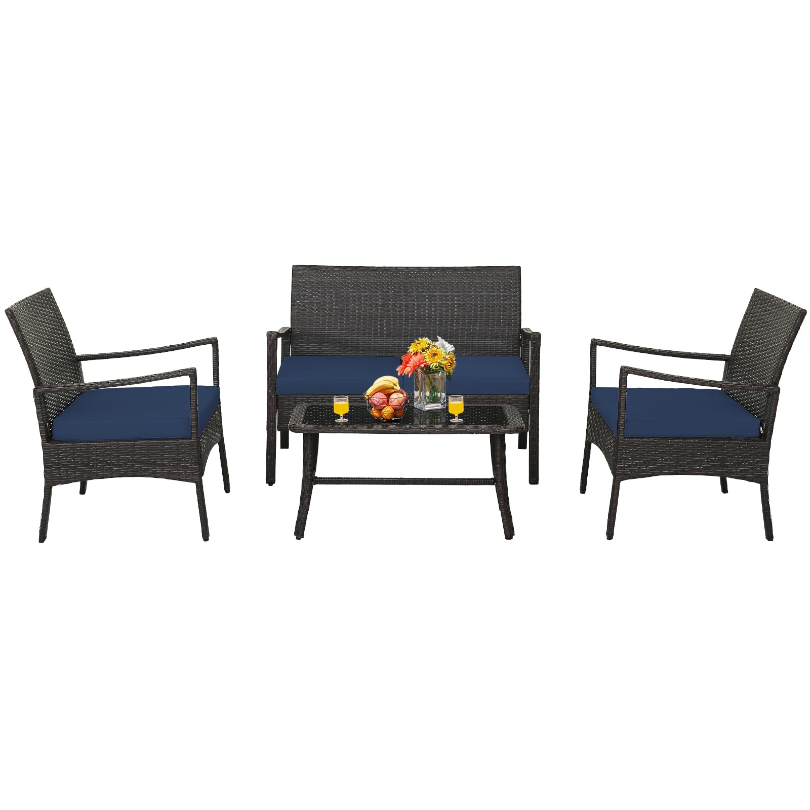 4-Piece Rattan Patio Conversation Set with Tempered Glass Coffee Table