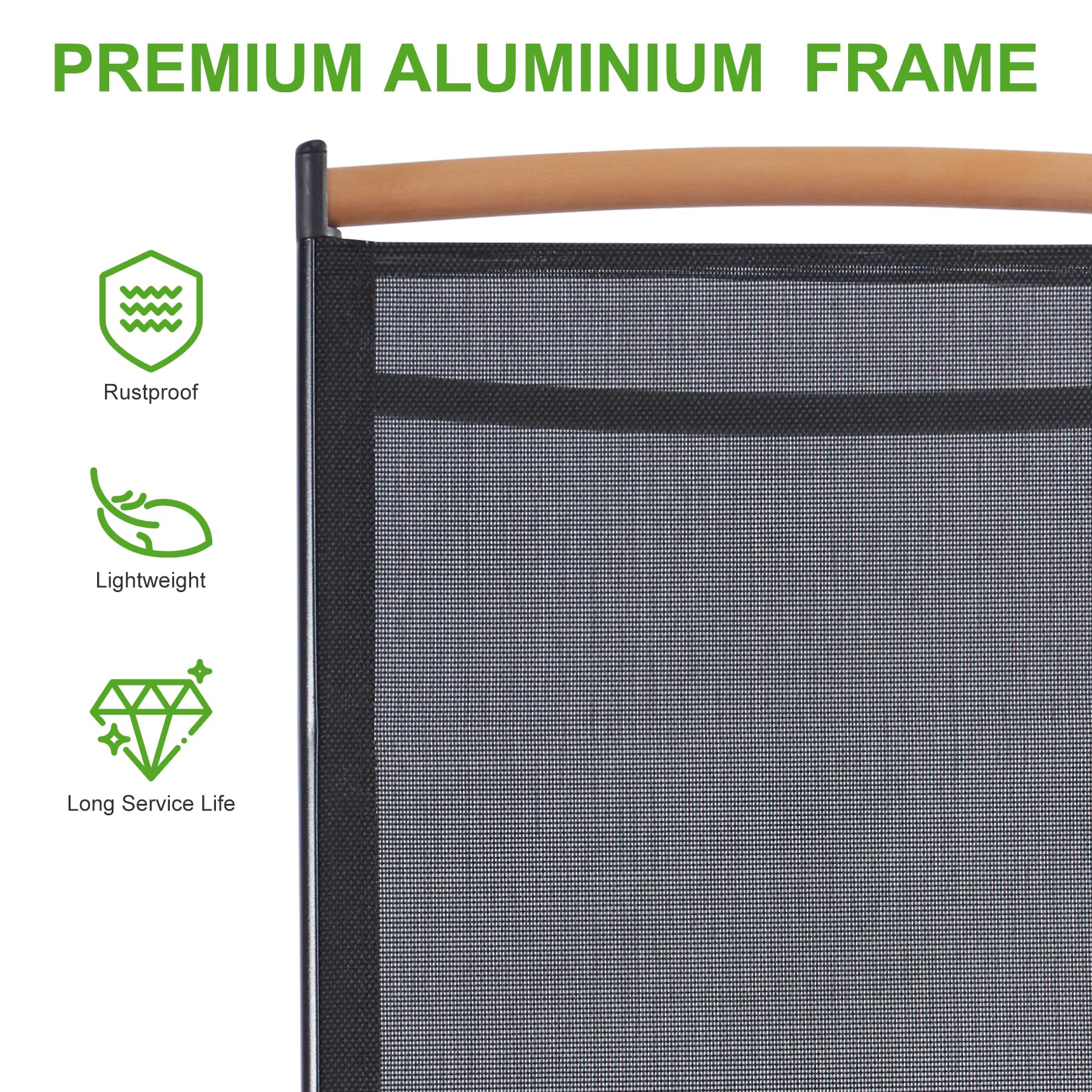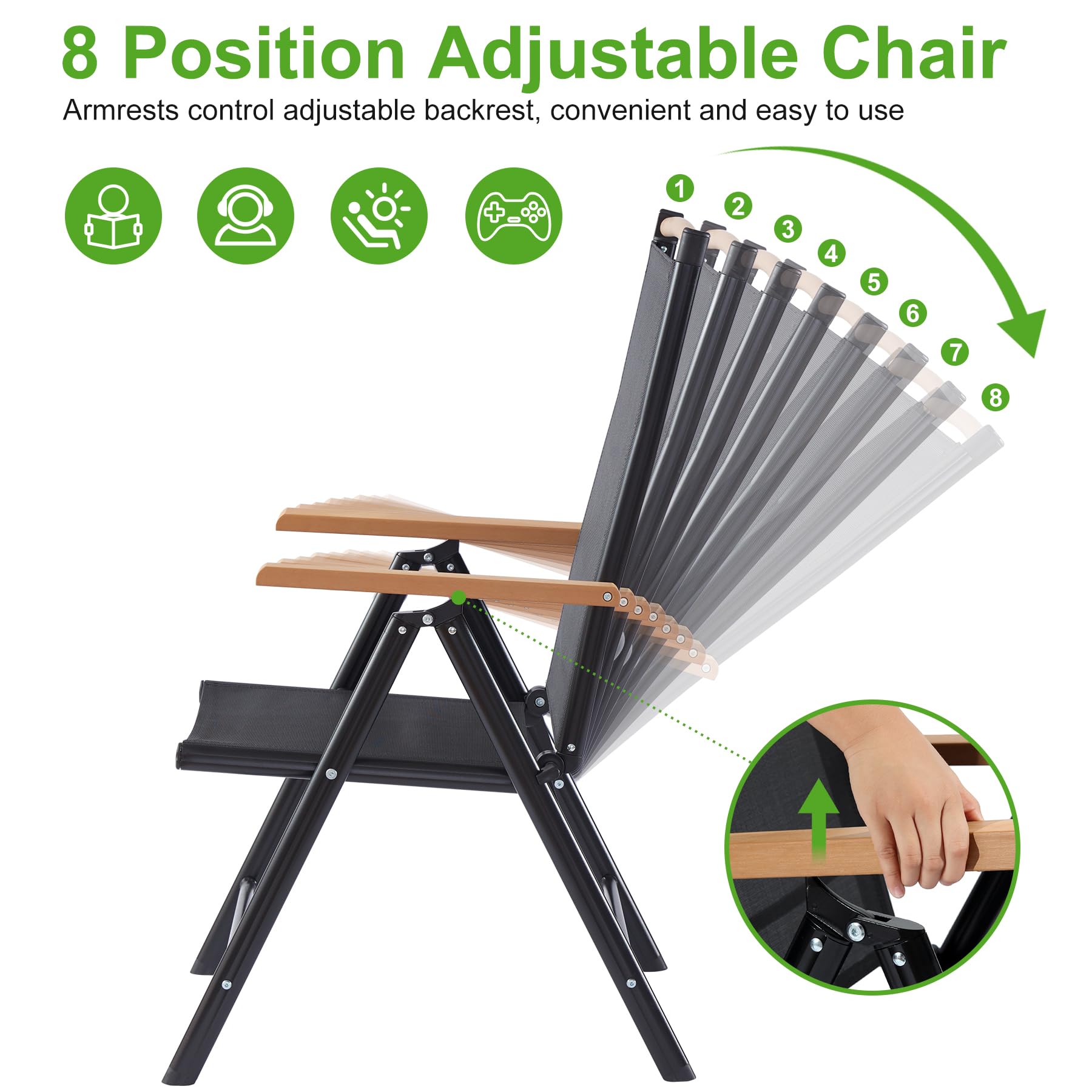 - 8 RECLINING POSITIONS: The ergonomic curve-designed outdoor lounge chairs feature 8 adjustable reclining positions for a comfortable outdoor lounging experience. It is perfect for sunbathing, relaxing, or enjoying a good book. With the concise design and classic black appearance with a wood-like armrest, the chair can complement any indoor & outdoor daily occasion.
