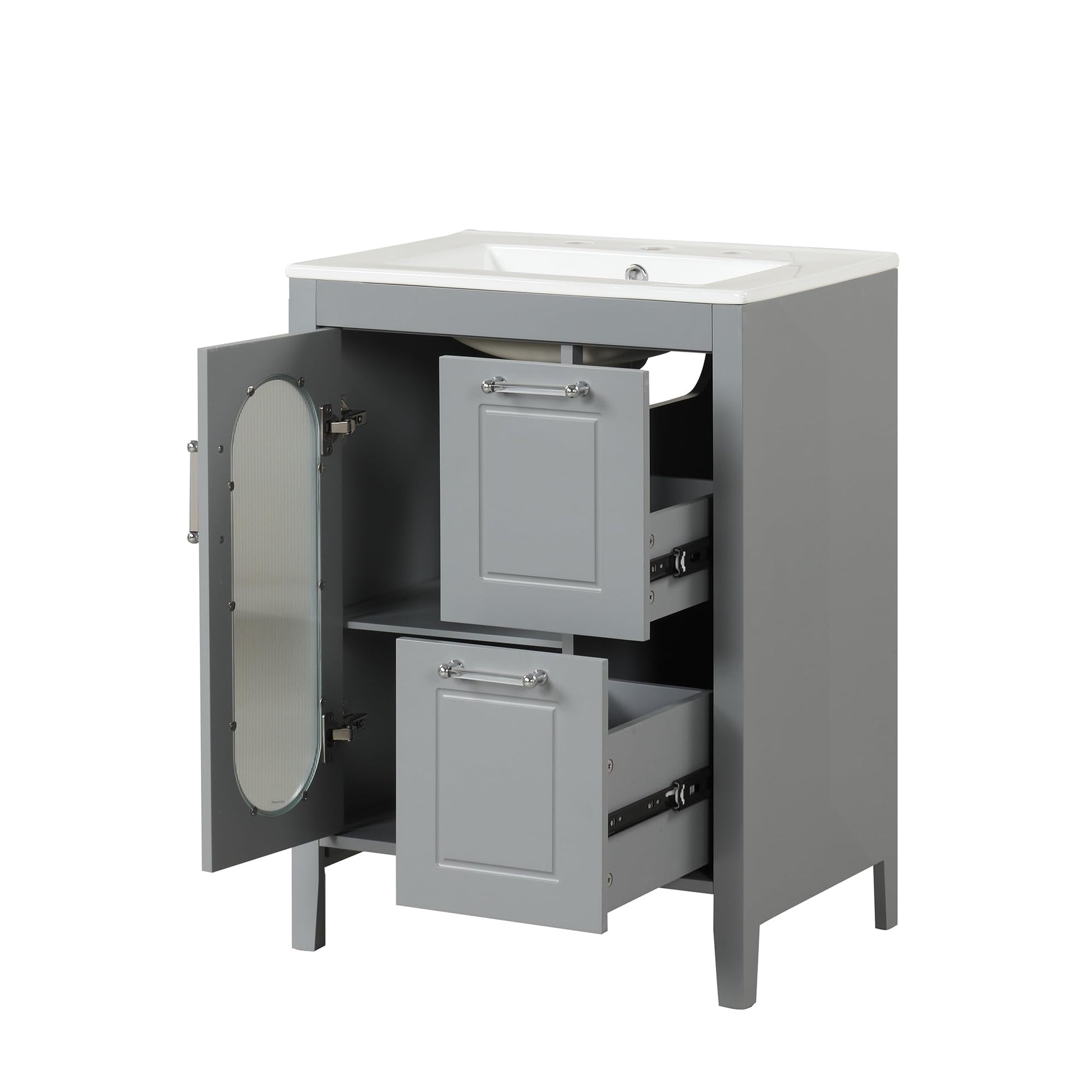- This 24" bathroom vanity cabinet is suitable for a bathroom in any decoration style. The freestanding vanity cabinet with silver handles complies with your bathroom facilities. Besides, the door is designed with moru glass, which has a hazy aesthetic feeling and adds elegant elements to your bathroom