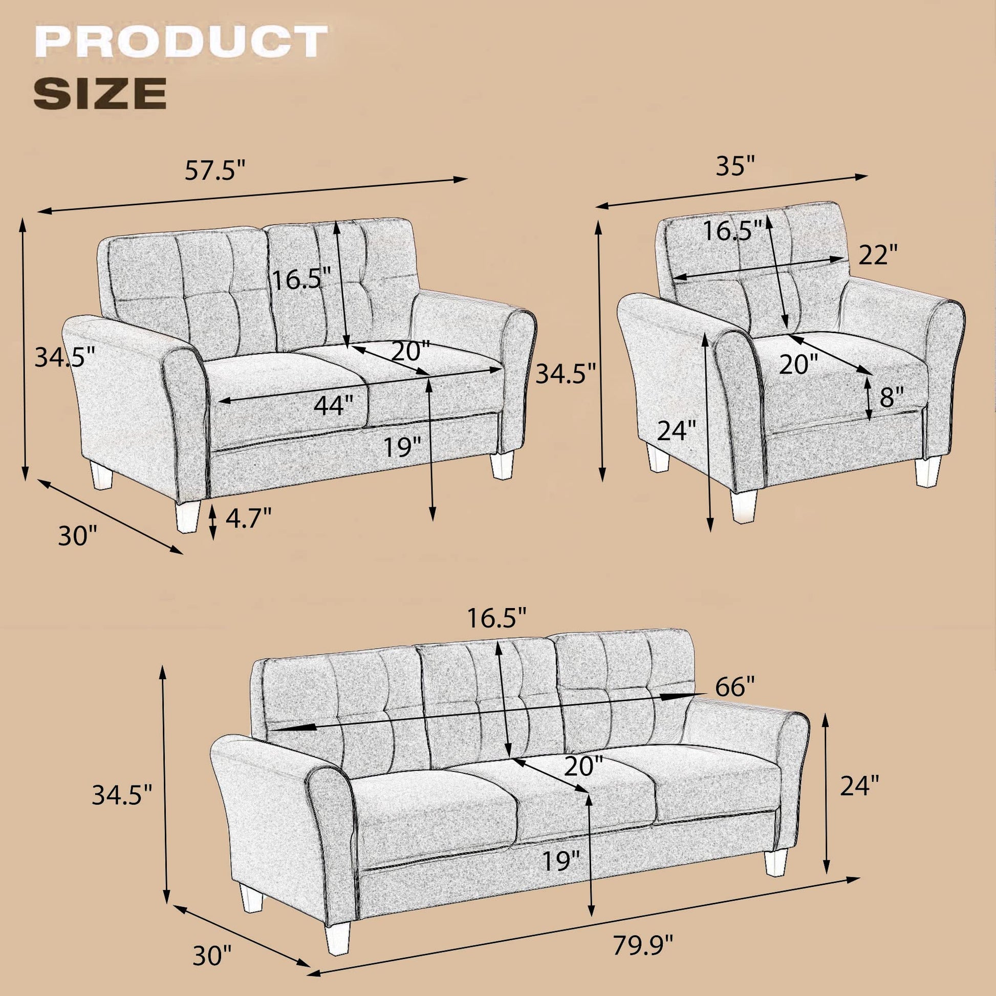 - 3 pieces Sofa Set Complete 3-piece sofa set includes 1 three seater sofa, 1 loveseat and 1 aremchair perfect for filling living rooms and seating guests with ample space. Dimensions--3-Seat Sofa: 34.5'' H x 79.9'' W x 30'' D. Loveseat: 34.5'' H x 57.5'' W x 30'' D. Sofa Chair: 34.5'' H x 35'' W x 30'' D. This product comes with three boxes.
