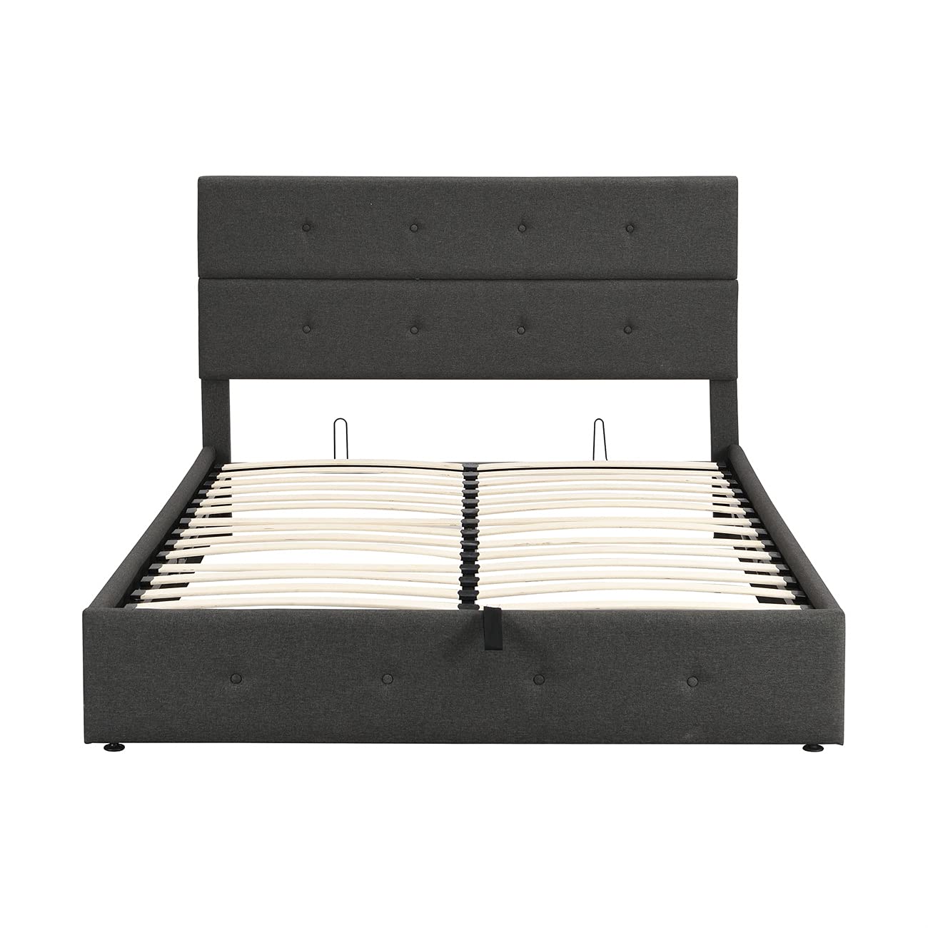 - The linen upholstered bed's gas lift mechanism makes lifting really effortless. The hydraulic storage system underneath the mattress is perfect for you to store quilts, bed sheets and other necessities. Practical bedding option with a storage compartment underneath. Perfect space saving functionality.