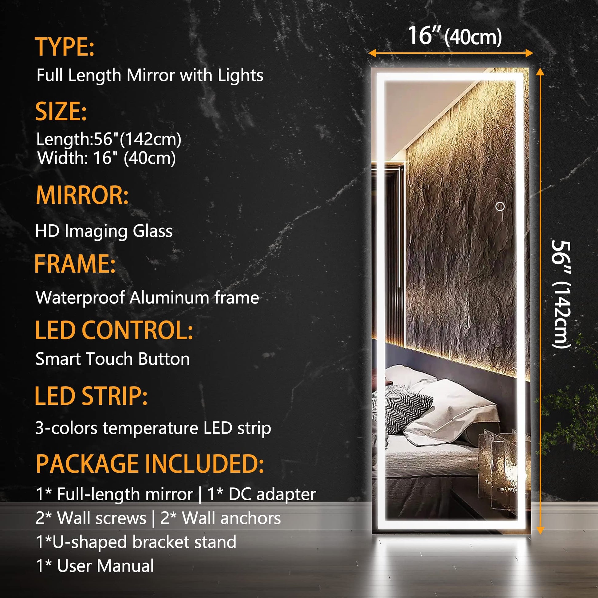 Full Length Mirror with Lights, 56" x 16" LED Floor Mirror, Full Body Dressing Standing