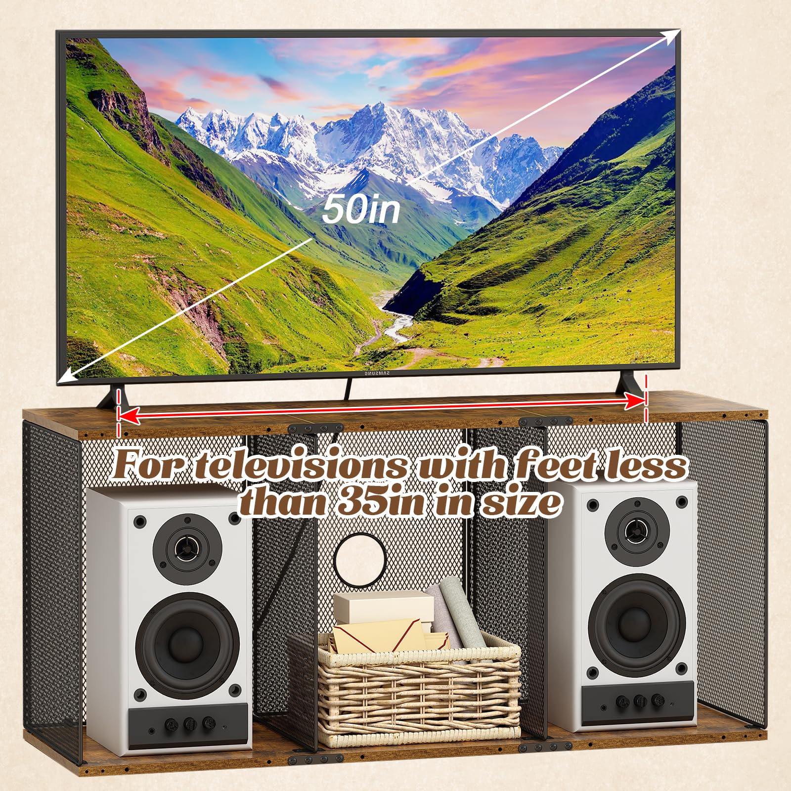 - Heavy Bearing Capacity:Made of MDF wood+metal high quality material,the TV table frame is sturdy,wear and scratch resistant, stable and reliable,with a total load capacity of 150 lbs,suitable for small TV sets (up to 50 inches)-less than 35 inches between the two feet.