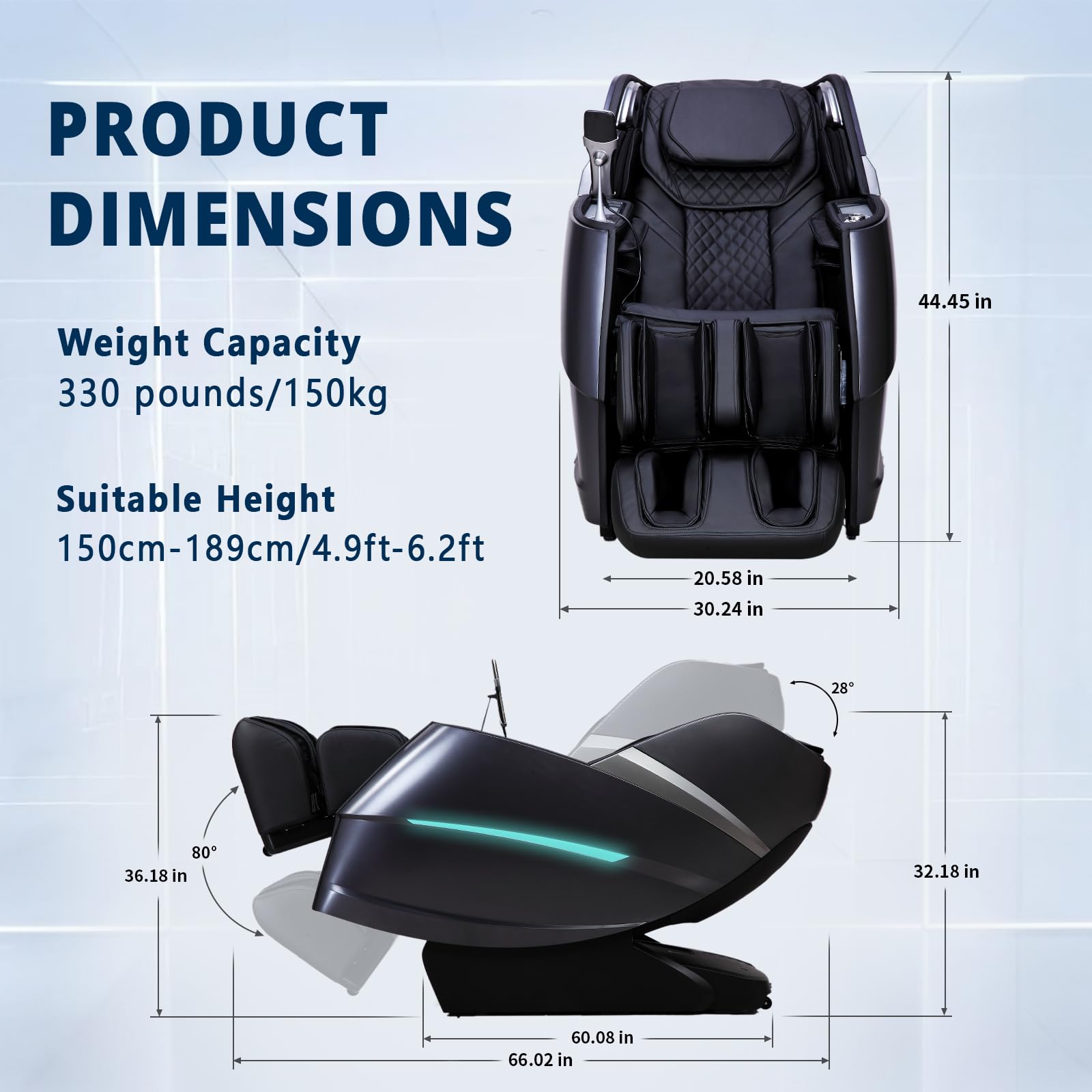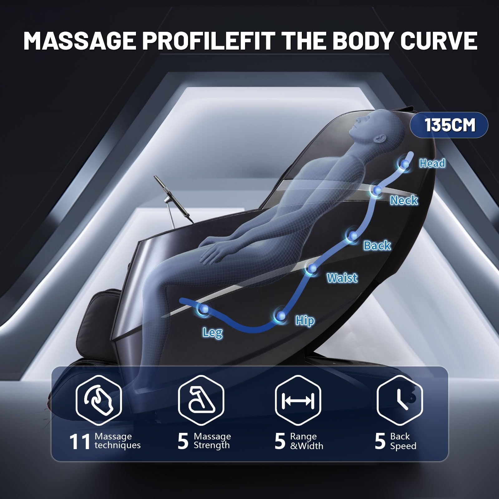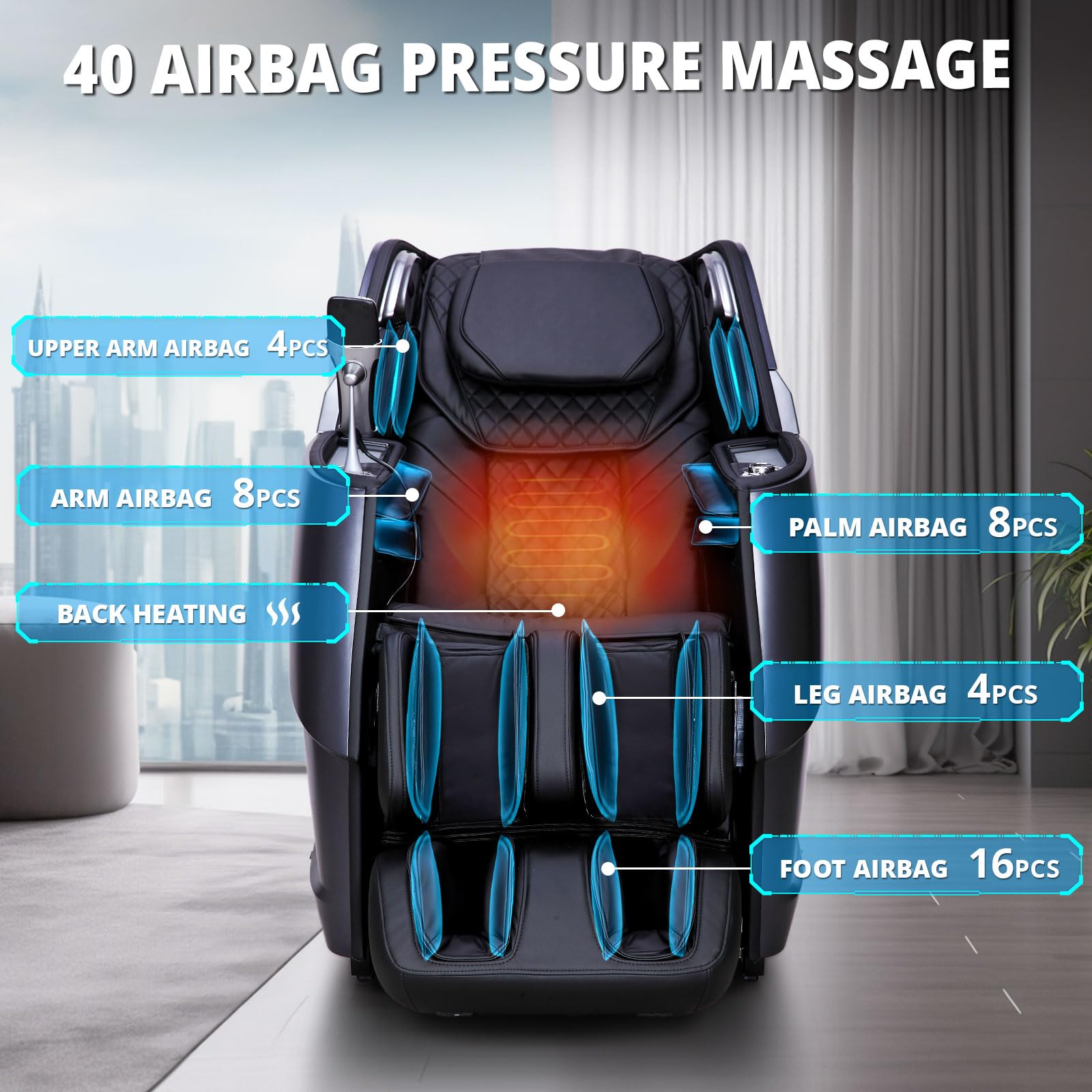 - 55" S+L Track Based on human ergonomics and research on different body curves, a new generation of hyperbolic rails has been developed to perfectly adapt to the neck, shoulders, back, waist, hips, and legs in all directions. With a dual V-massage robot, it enables closer and deeper massage of the entire body. Designed for unique massage experiences that combine gentle rubbing, stretching, and tapping.10 modes, 11 techniques, 40 airbag points all over the body, 3 levels of airbag pressure, compressing shoulders, arms, feet and buttocks, help relieve body pain.