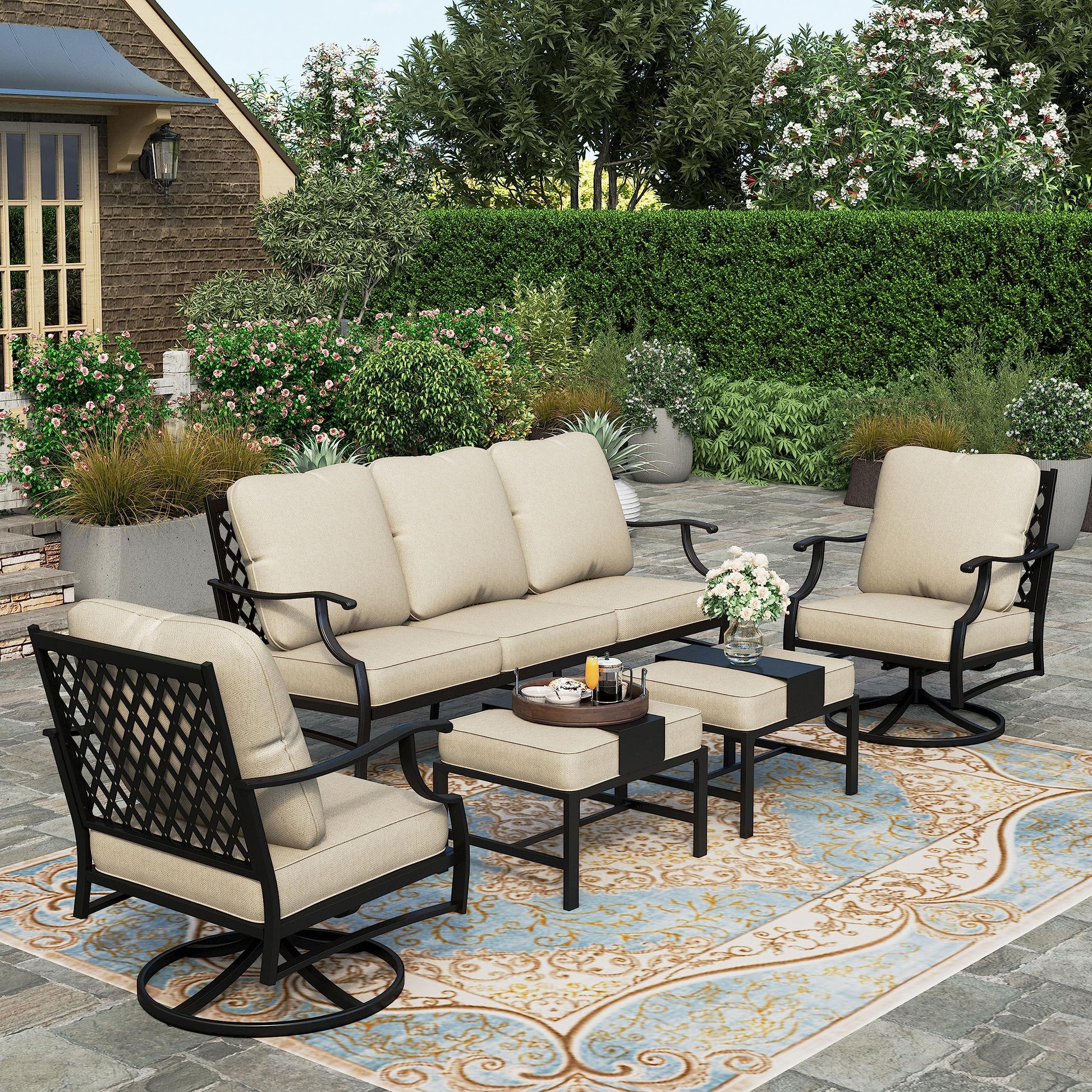 - A PRACTICAL OUTDOOR FURNITURE SET Including 2 x cushioned swivel metal chair, 2 x ottoman, 1 x 3-seat sofa. Perfectly fitting with your backyard, poolside, balcony, garden and deck to create an outdoor comfort zone. A REAL PRACTICAL patio conversation set perfectly meet the requirement of enjoying outdoor leisure time like a meal or host a party with your family or friends.