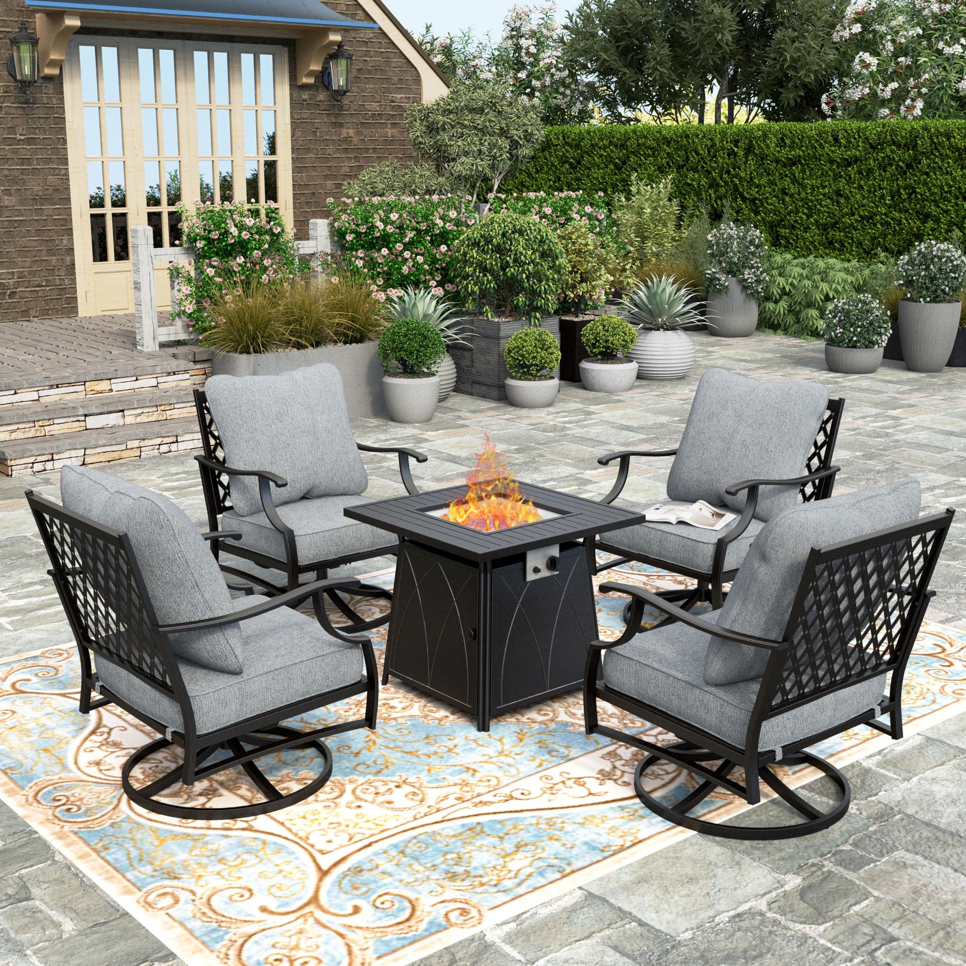 - Including 1 x fire pit table, 4 x cushioned swivel chair. Perfectly fitting with your backyard, poolside, balcony, garden and deck to create an outdoor comfort zone. A REAL PRACTICAL conversation set perfectly meet the requirement of enjoying outdoor leisure time like a meal or host a party with your family or friends.