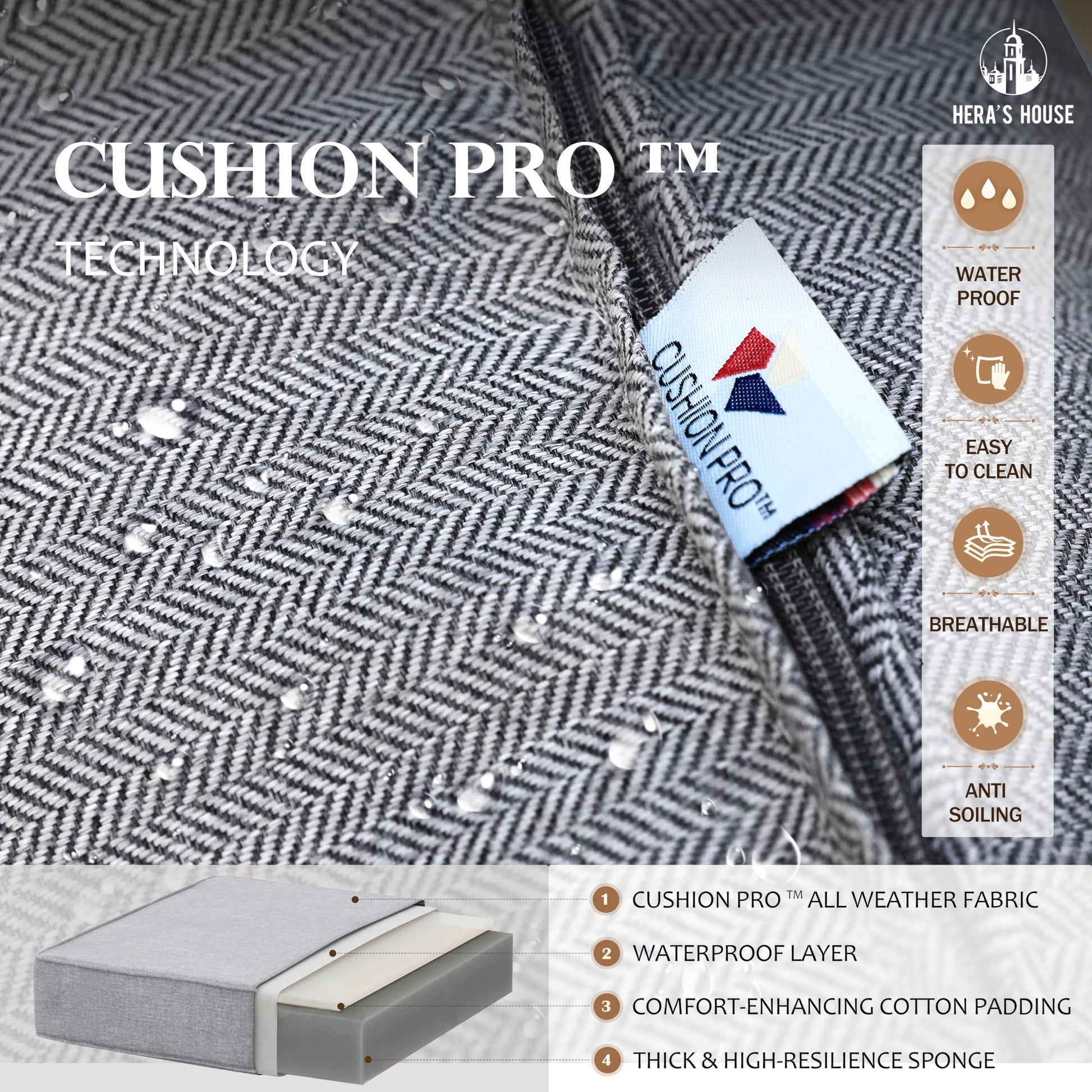 - ALL WEATHER USE Special CUSHION PRO technology applied on the fabric of this conversation set. It makes the dirts be easily wiped down. Water-proof and oil-proof perfectly for all seasons use.