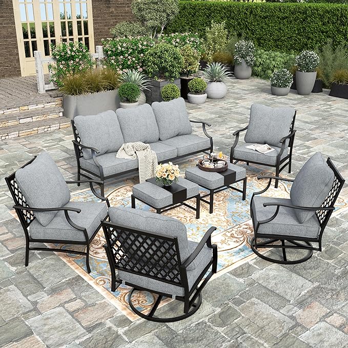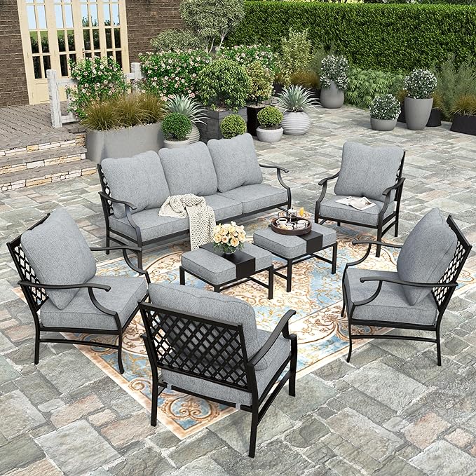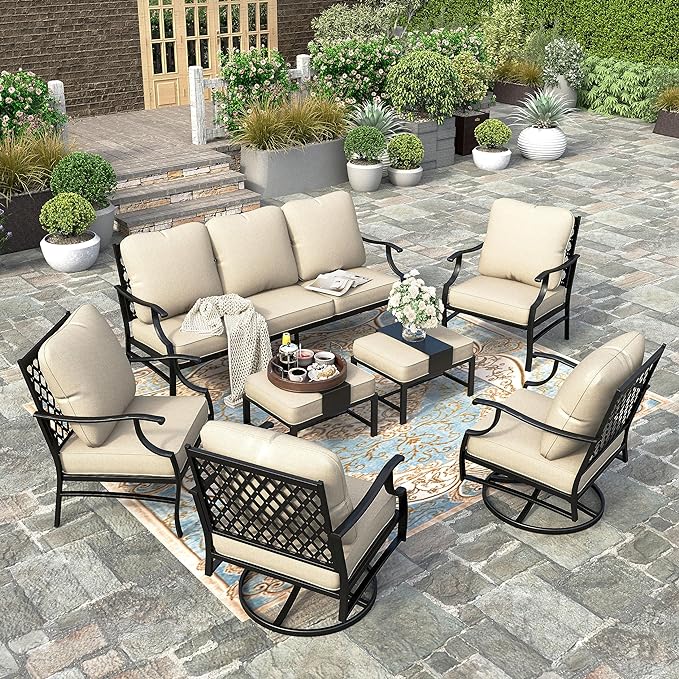- A PRACTICAL OUTDOOR FURNITURE SET Including 2 x cushioned rocking metal chair, 2 x cushioned fixed chair, 2 x ottoman, 1 x 3 seat sofa. Perfectly fitting with your backyard, poolside, balcony, garden and deck to create an outdoor comfort zone. A REAL PRACTICAL patio conversation set perfectly meet the requirement of enjoying outdoor leisure time like a meal or host a party with your family or friends.