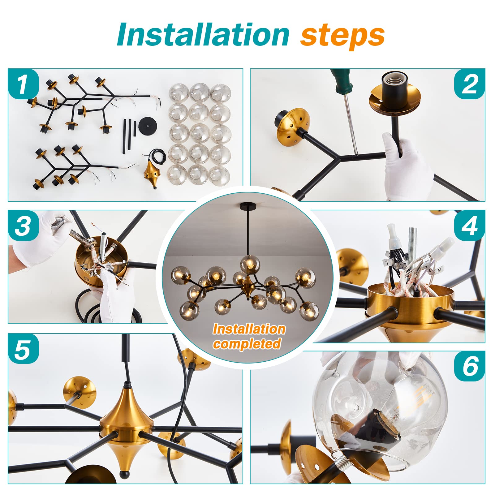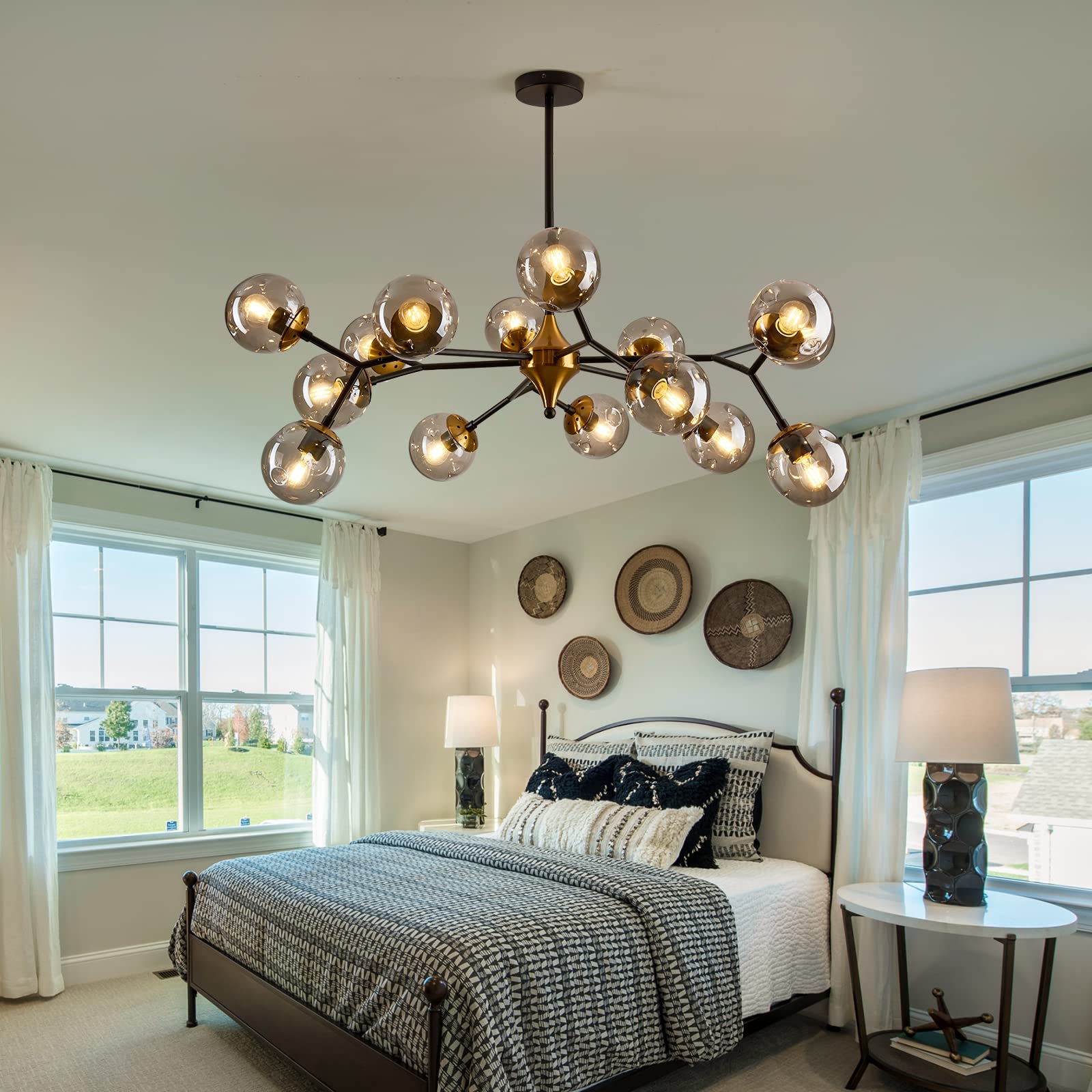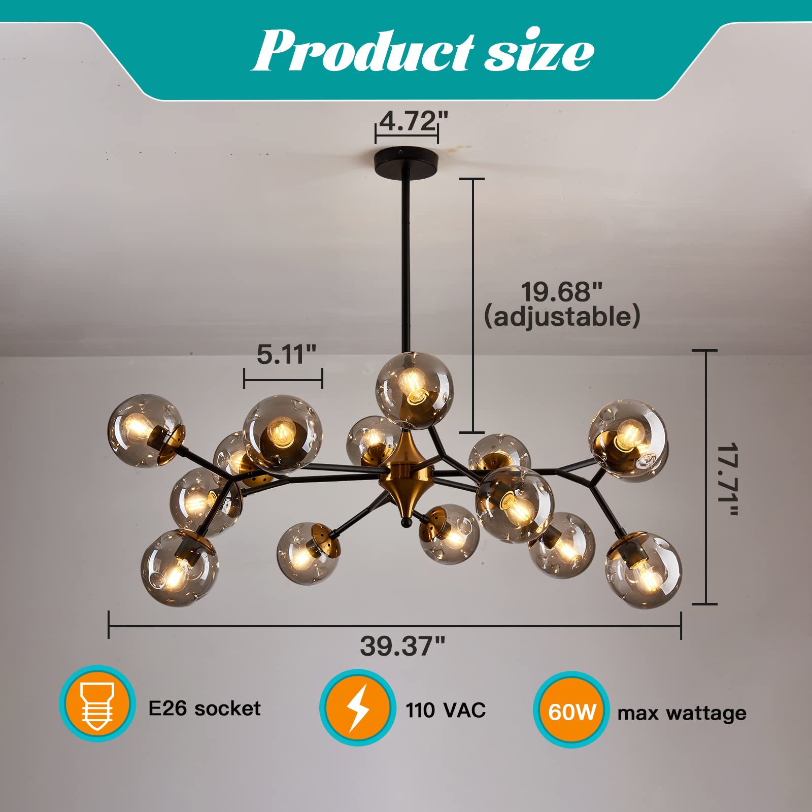 - Contemporary industrial design: The 15-light semi flush chandelier traditional smoke grey bubble glass ball for more heat resistance and softer lighting. High-temperature baked matte black metal and electroplated gold fixtures are resistant to paint loss and oxidation.