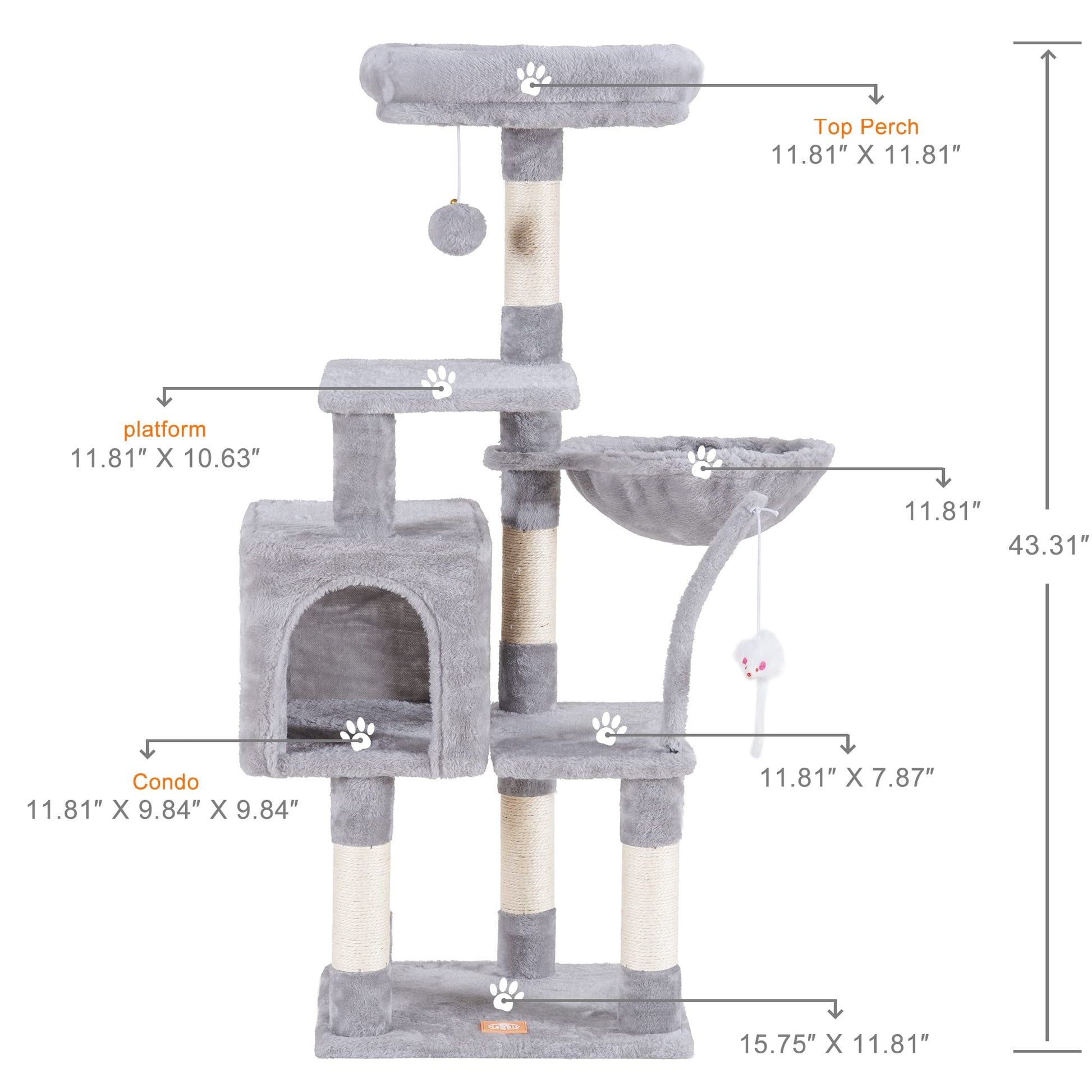 To keep your cats engaged, the tower also features an interactive dangling toy, stimulating their natural hunting instincts and providing hours of entertainment. Whether your cat loves climbing, lounging, or playing, this cat tree is designed to support all their activities in a safe and enjoyable way.
