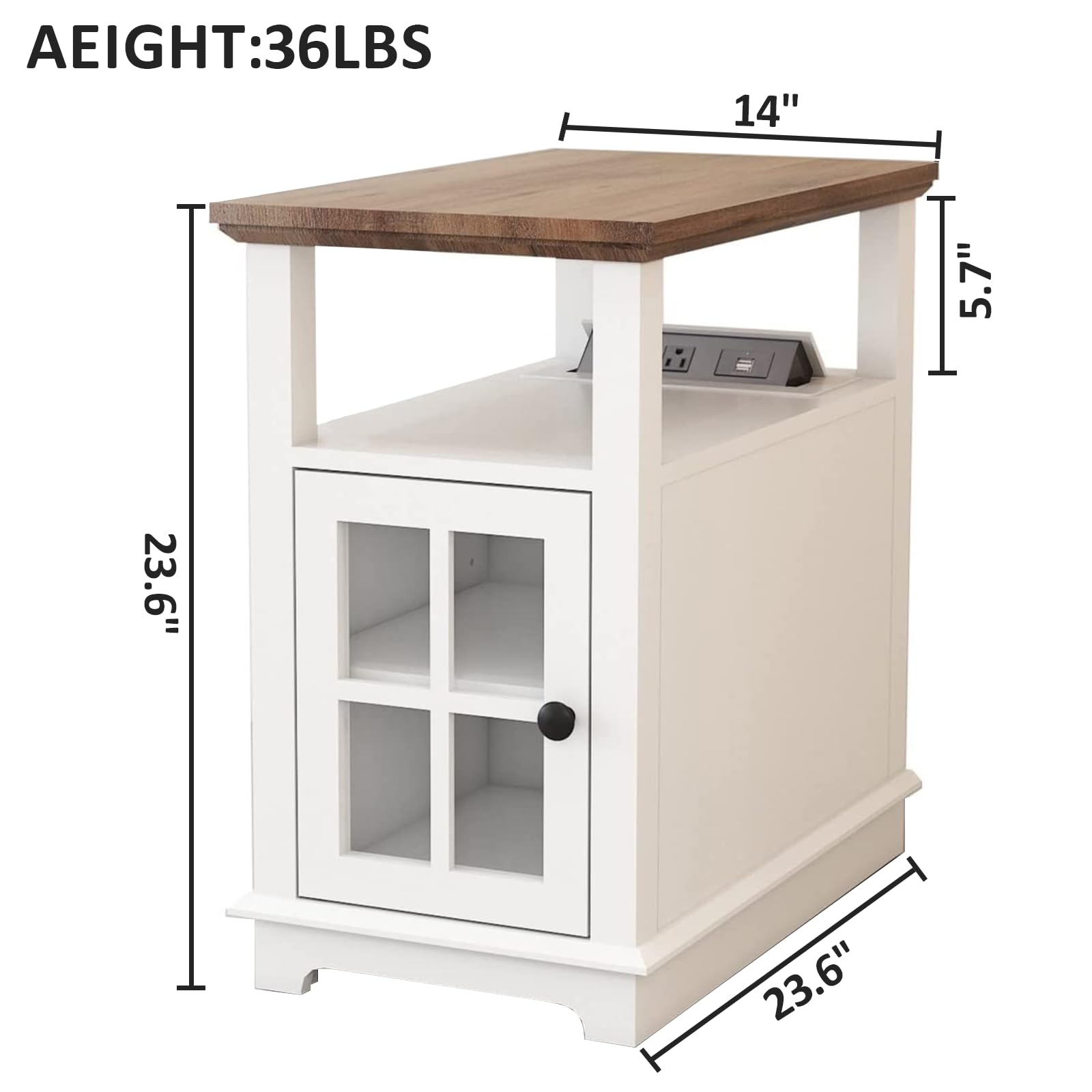 End Table with Charging Station, White Side Table with Storage, 2 Power outlets