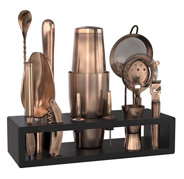 - BEAUTIFUL BAMBOO STAND: The cocktail shaker kit comes in a convenient, beautiful, and extremely sturdy bamboo stand. The stand is made of solid bamboo over 1/2in. thick and has a beautiful clear finish that is completely food safe. The stand is12.7in. wide 3in. tall.