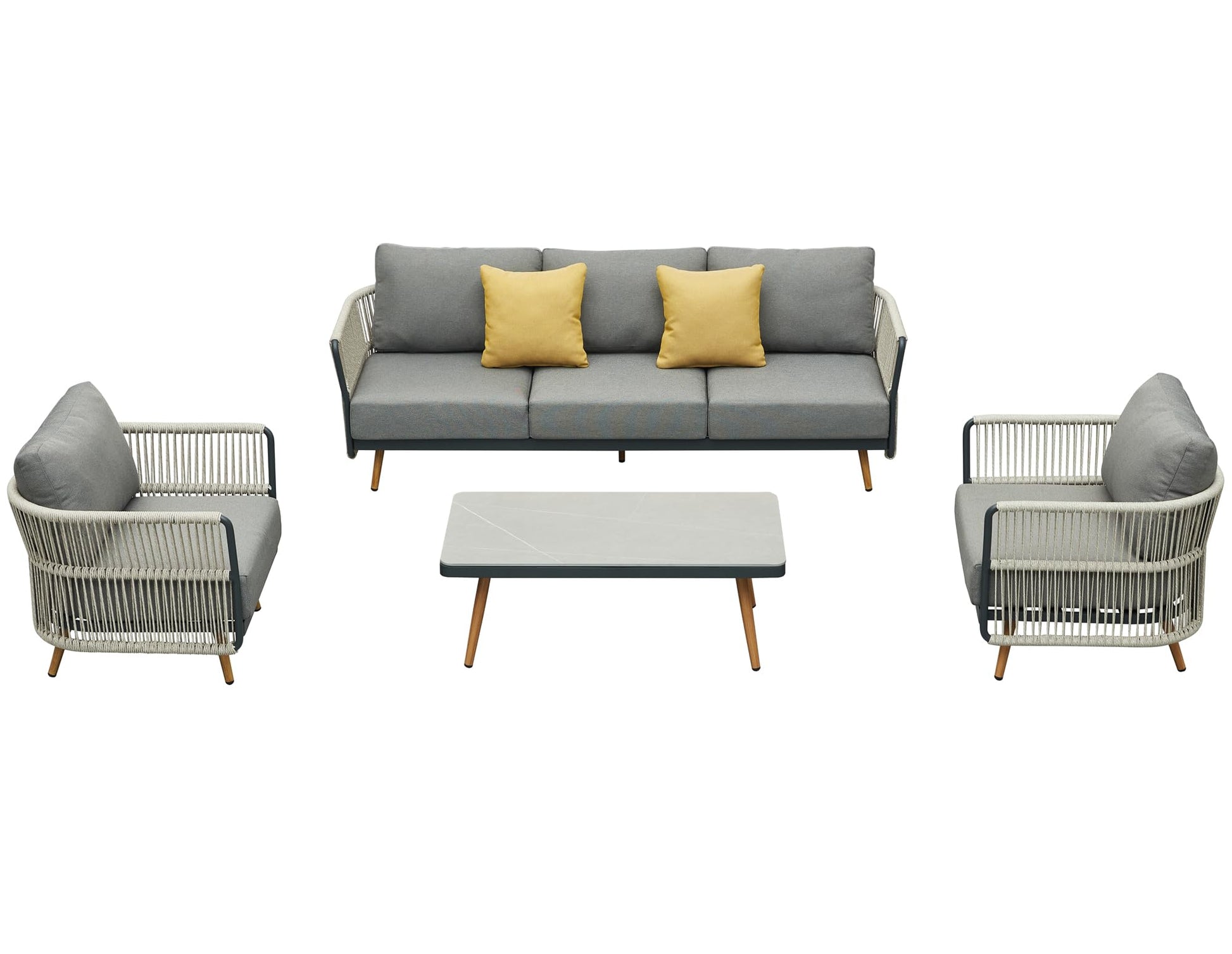 - Package include: 1 three-seater sofa, 2 single chairs, and 1 coffee table