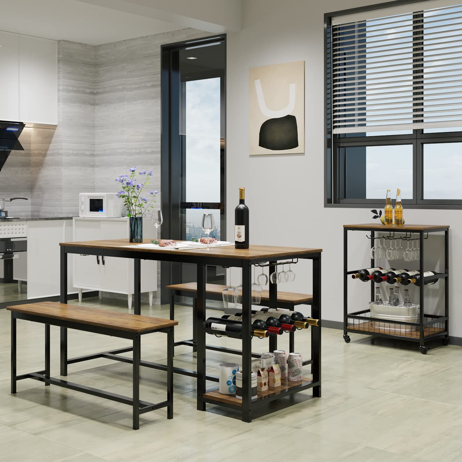3-Piece Dining Table Set, Rustic Wood Kitchen Dinner Table with Benches for 4