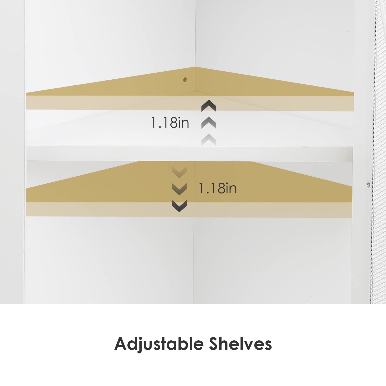 - Four open storage shelves offer vertical space to show off your adornment and keep oft-used items close at hand, while mesh door cabinet works perfectly for ventilated storage and helps to keep your living space neat and tidy. Overall Dimensions: 12.6"L x 12.6"W x 71.3"H