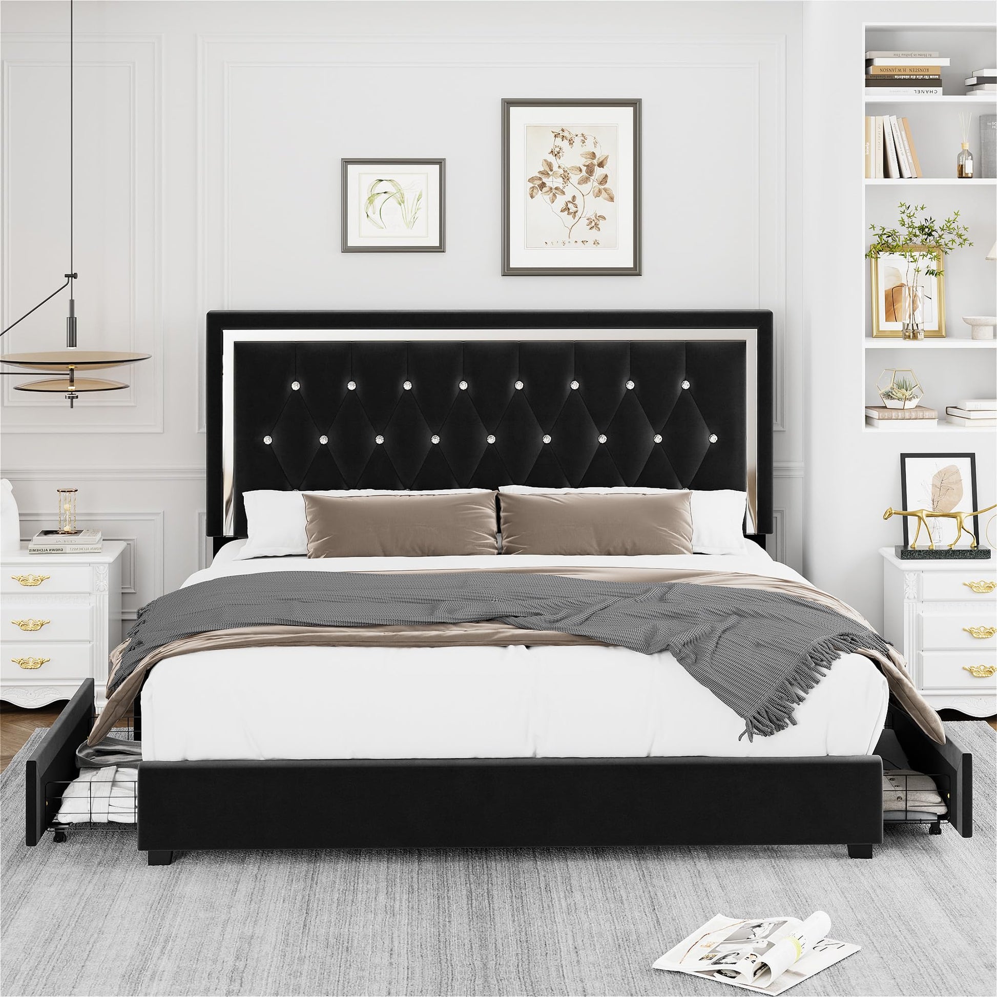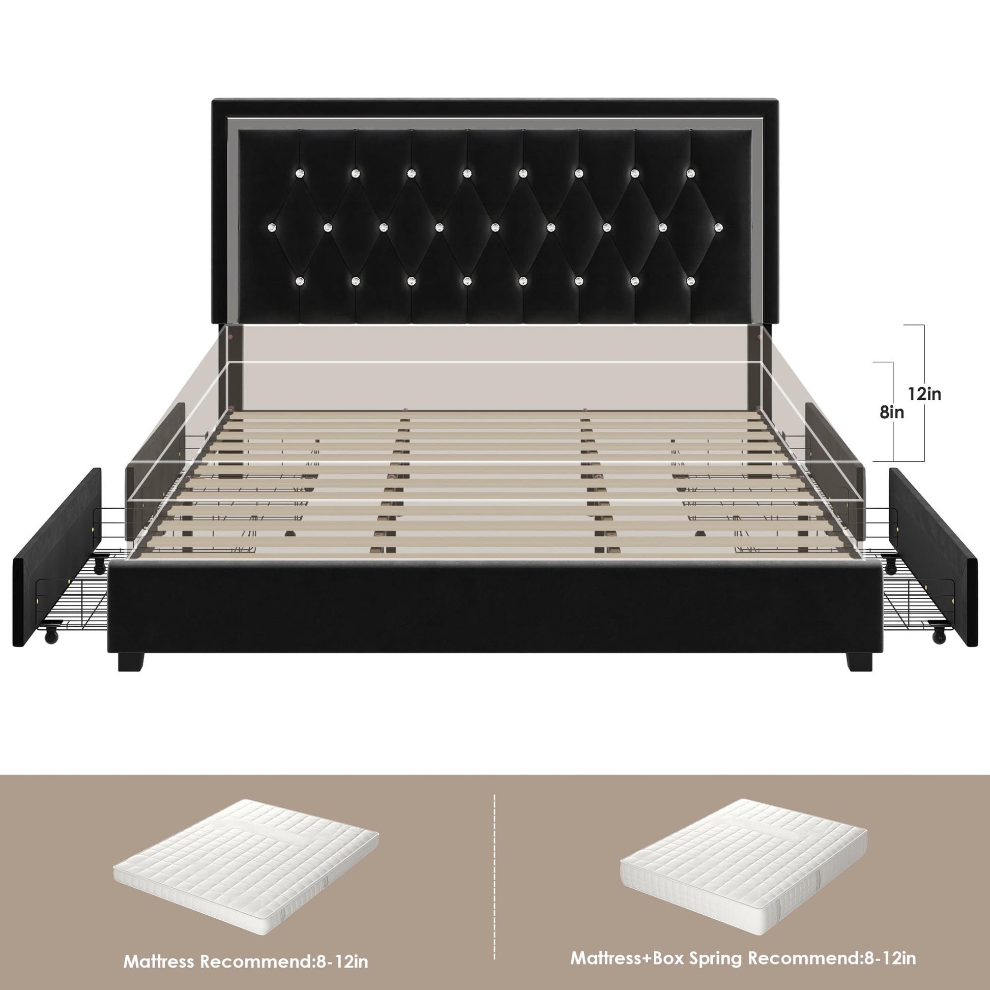 - Modern Platform Bed: The silver stainless steel trim and crystal buttons are highly decorative and aesthetically pleasing, and paired with the diamond tufted headboard, this bed with storage drawers is an easy complement to any bedroom or guestroom