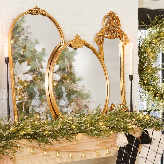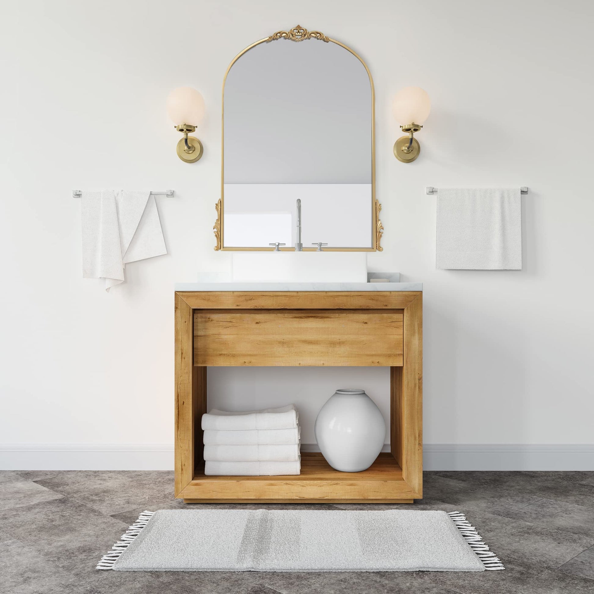 - Baroque-Inspired, Vintage Mirror: This arched bathroom mirror has a baroque-inspired theme, a gorgeous crown top, & a lovely flourish along both the bottom sides. Beautifully encased in curved metal framing, this arch wall mirror will be the perfect addition to any home.