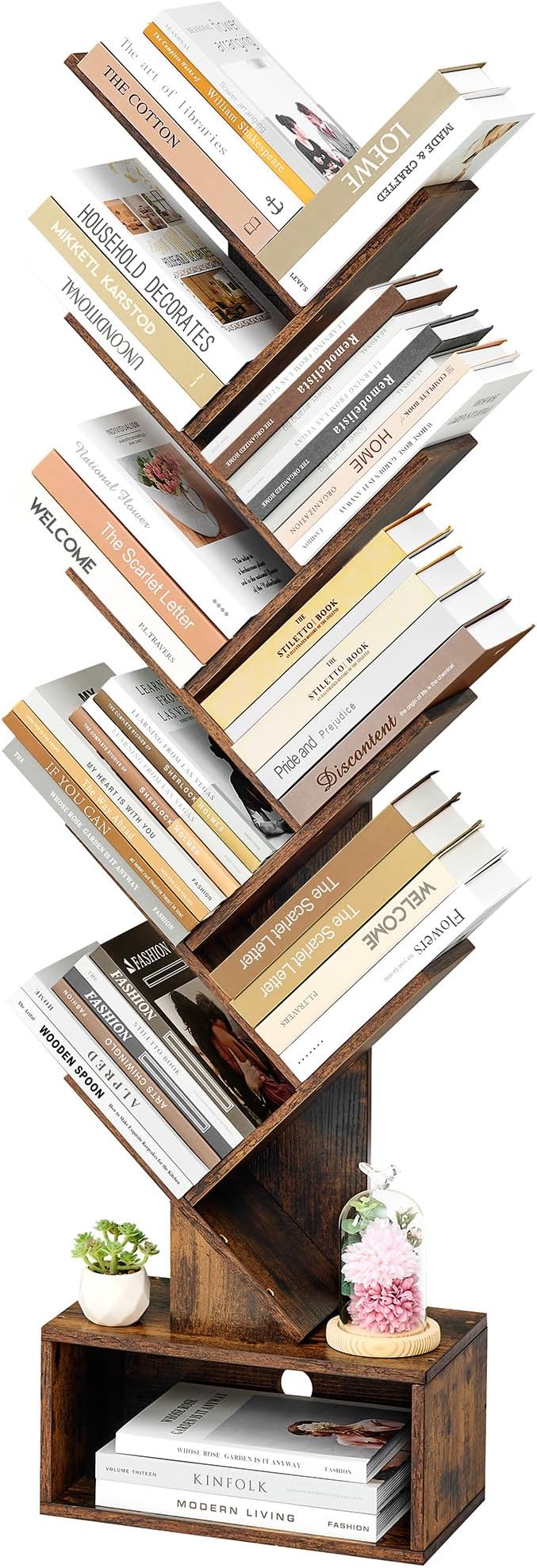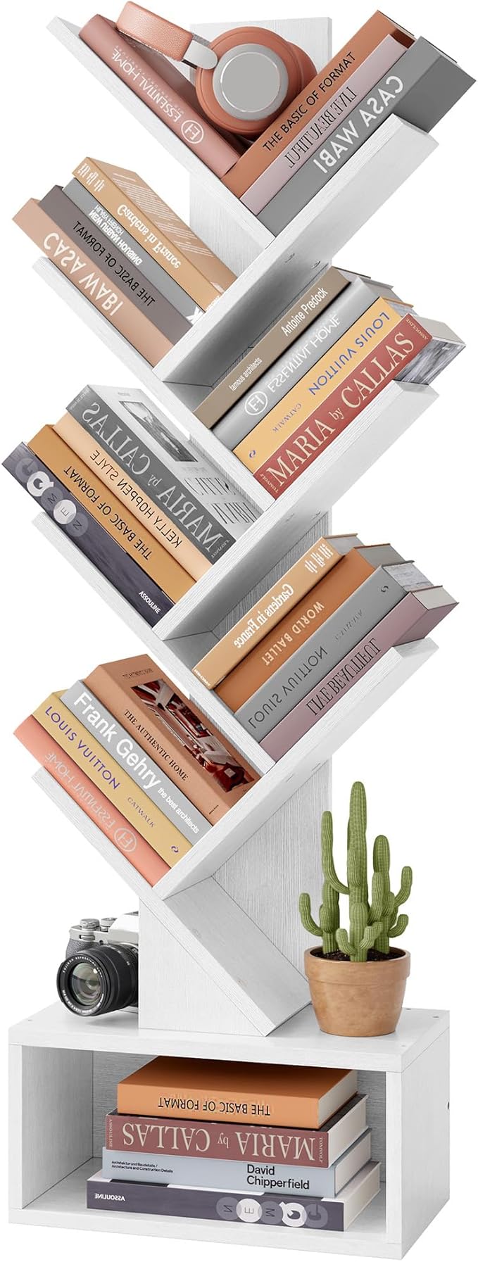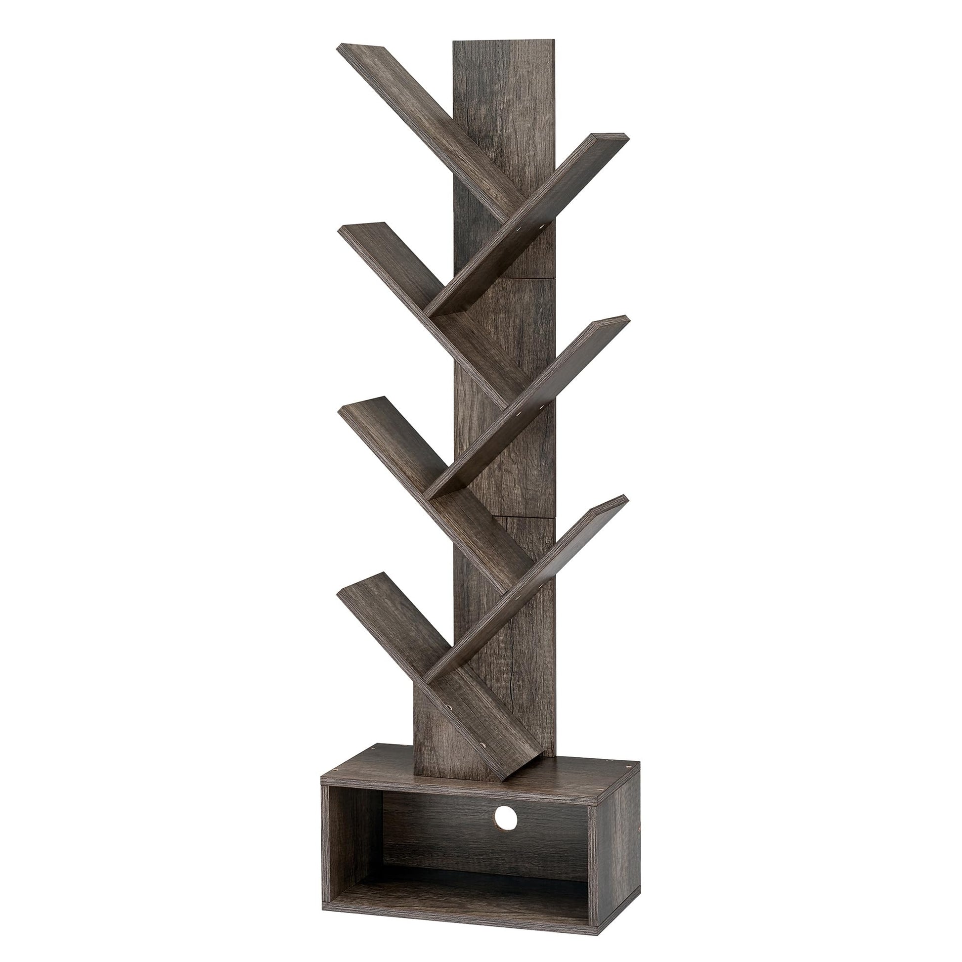 - Our 6-tier tree bookshelf offers 6 open shelves and a large drawer for storage. Whether it's books, decorations, CDs, magazines, video games, manga, novels, speakers, potted plants, photo albums, crafts, or other collections, you can easily organize them on this bookcase. With its narrow design, it can be moved easily to any corner or small space.