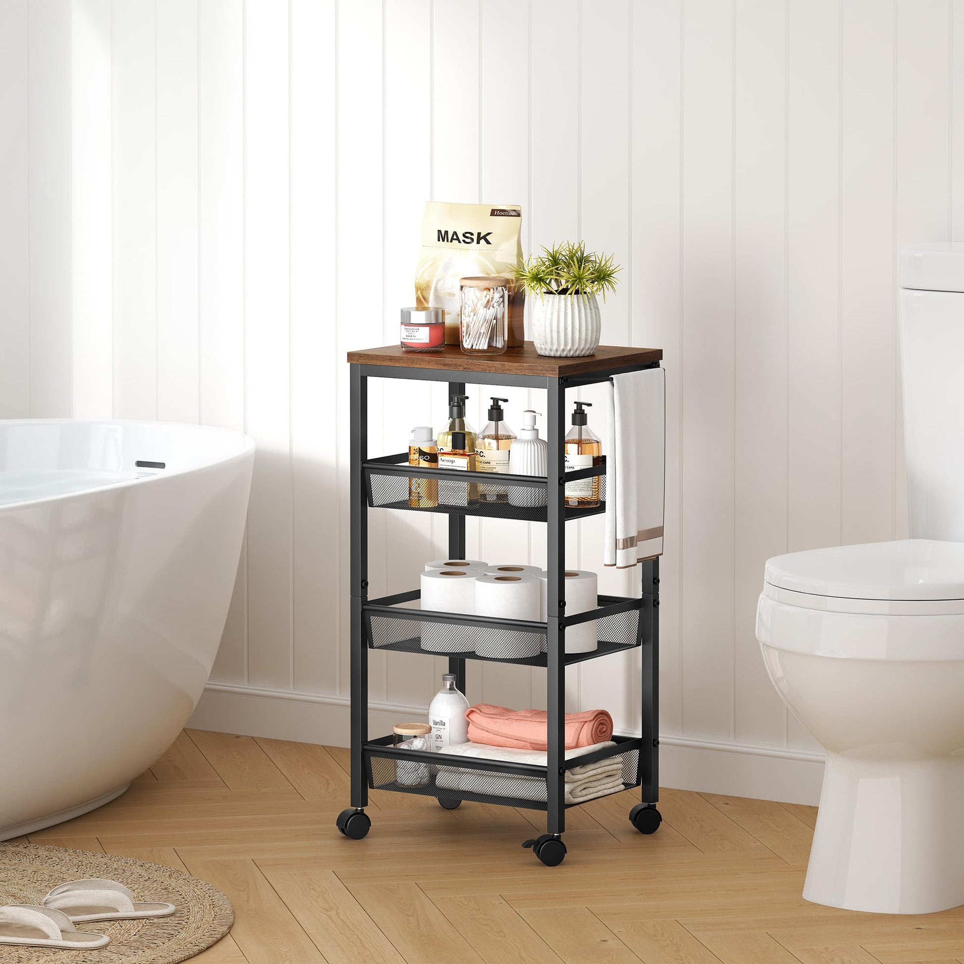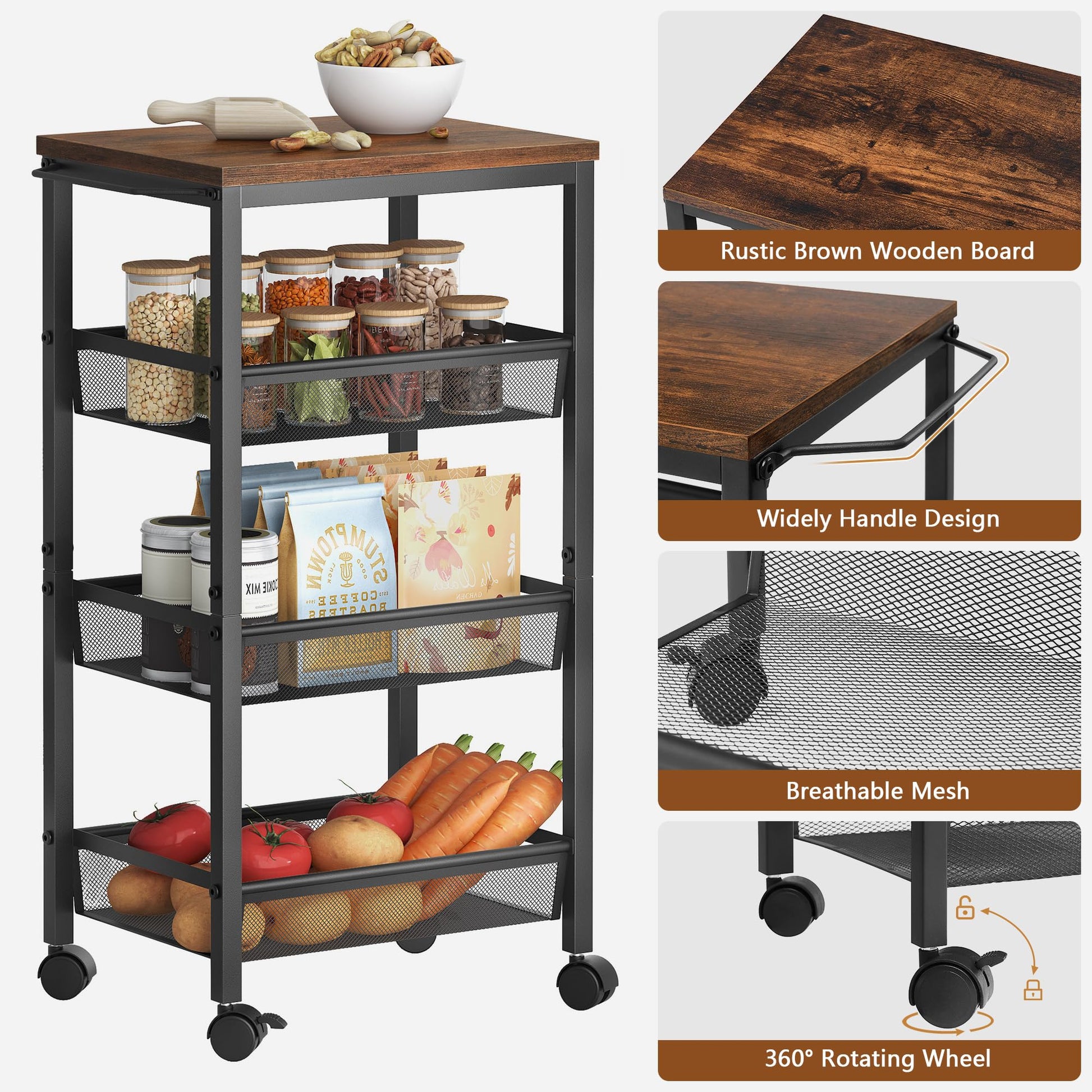 - KITCHEN STORAGE CART: 4 shelves made of metal material and wooden boards, easy to clean and durable. Shelves are fitted with wire shelves and are hollowed out for easy drainage. The top shelf can safely hold approximately 60-110lbs of heavy items and the bottom 3 tiers of storage baskets have a maximum weight capacity of 22-44lbs, perfect for your family's storage needs.