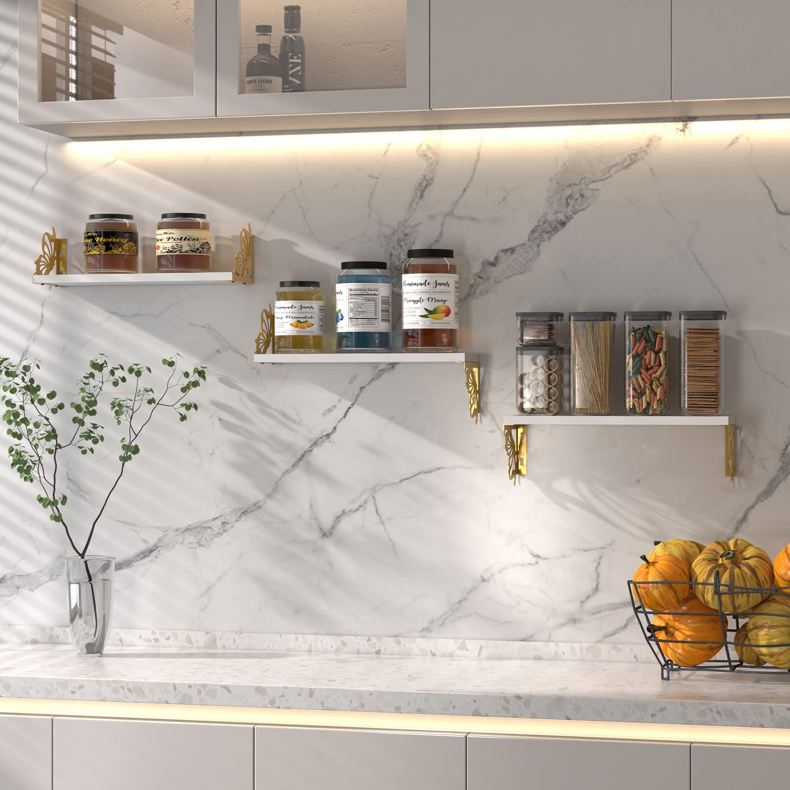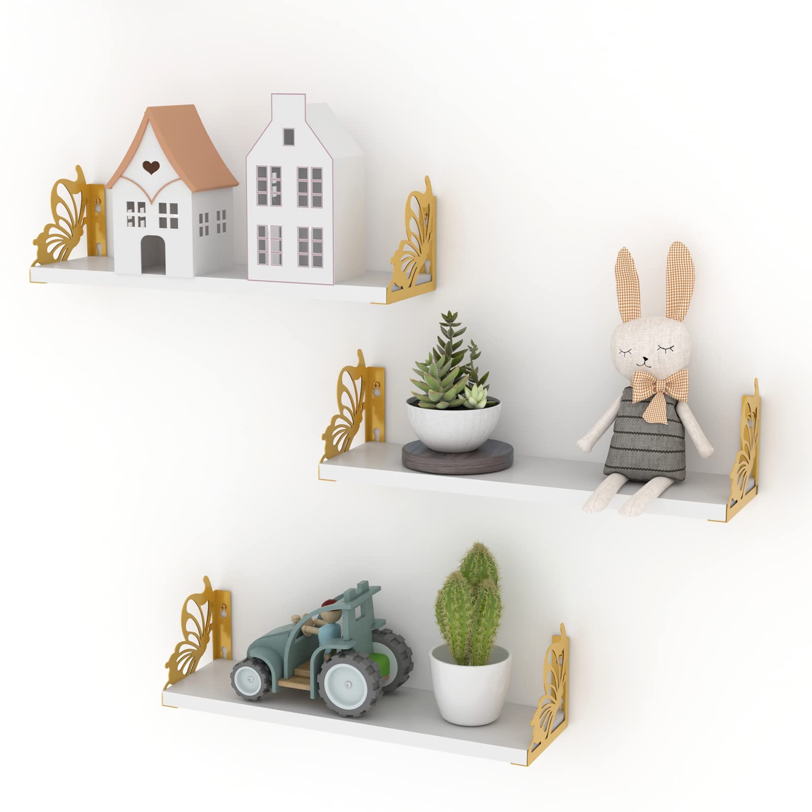 - White and Gold Floating Shelf: The shelf for wall combines white composite wood with gold metal butterflies, simple and elegant. Butterflies around your photos, plants, or collectibles, to show a kind of lifelike beauty.