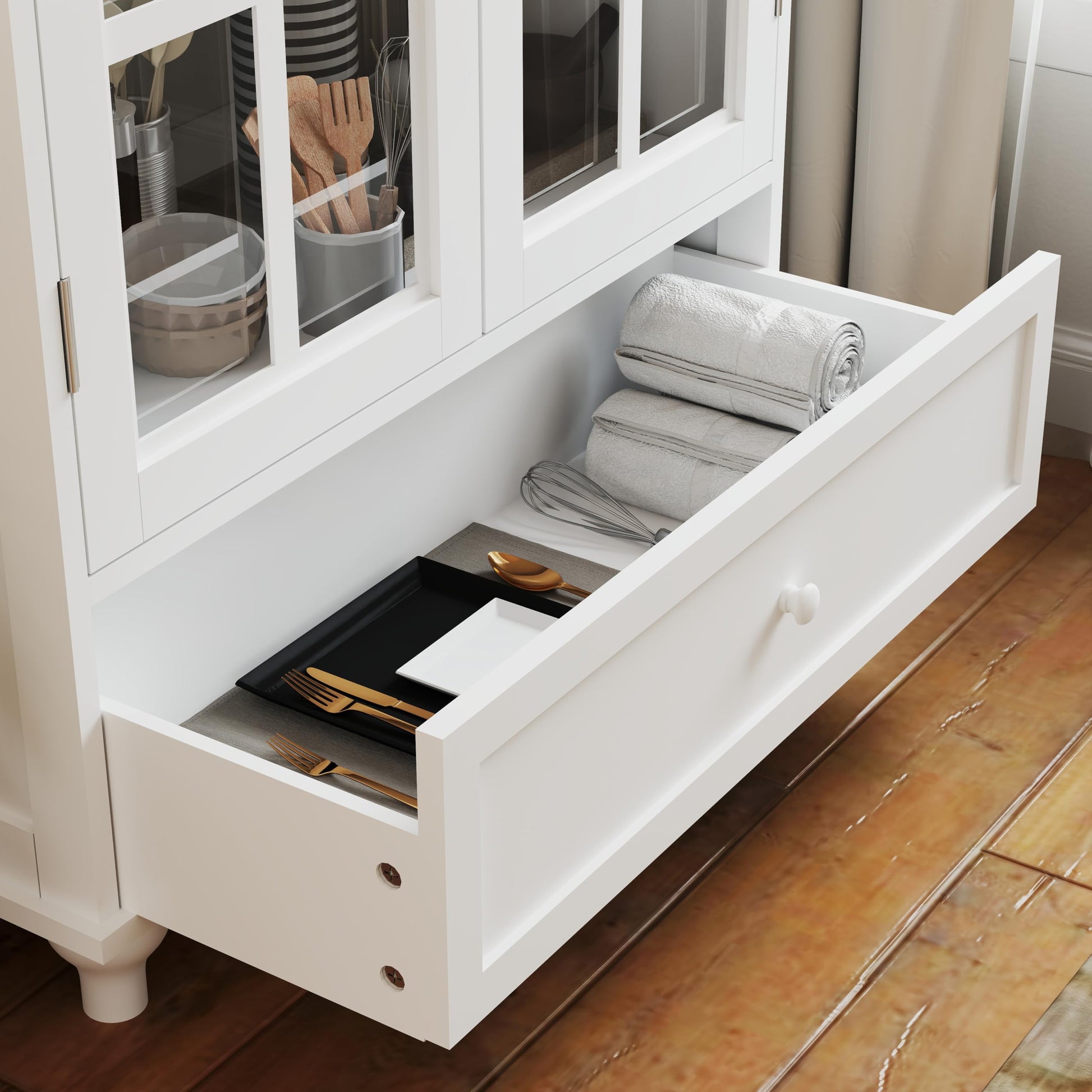 White Buffet Cabinet with Glass Doors and Drawers, Modern Wooden Buffet