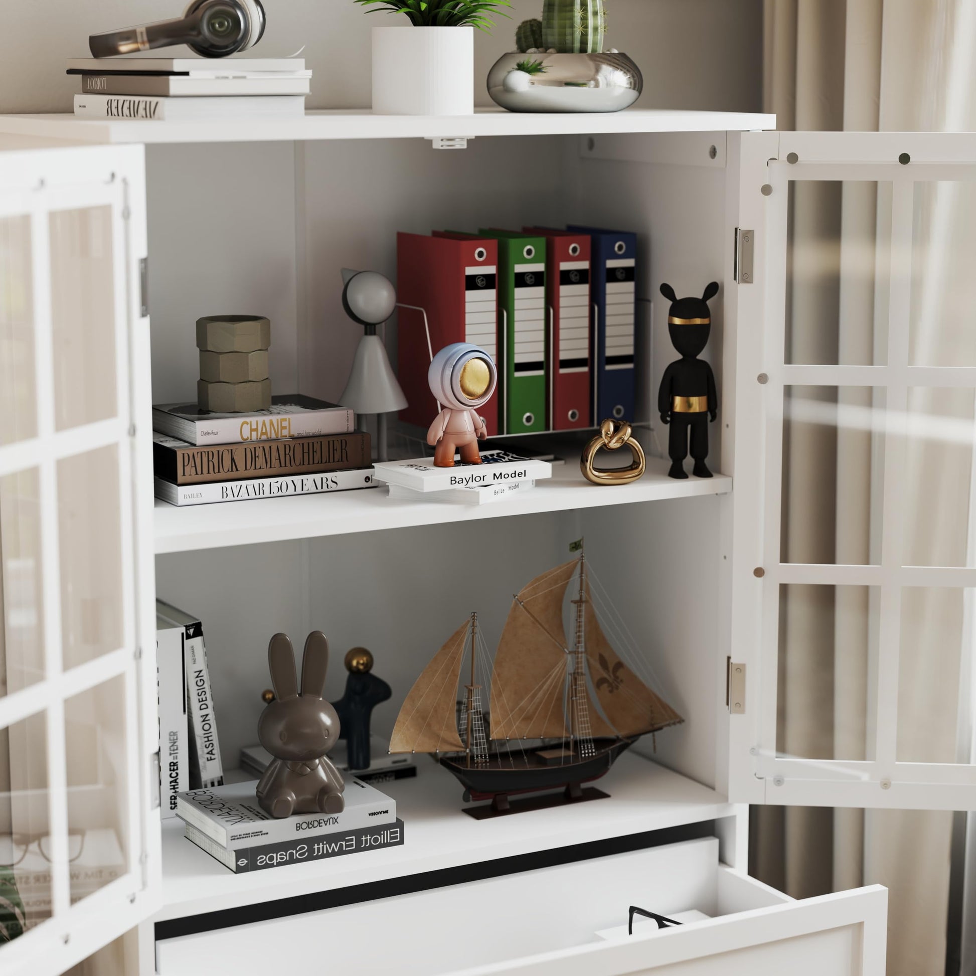 - Versatile Storage: This modern accent cabinet with double glass doors and a drawer offers ample storage space for living room, dining room, hallway, or entryway.