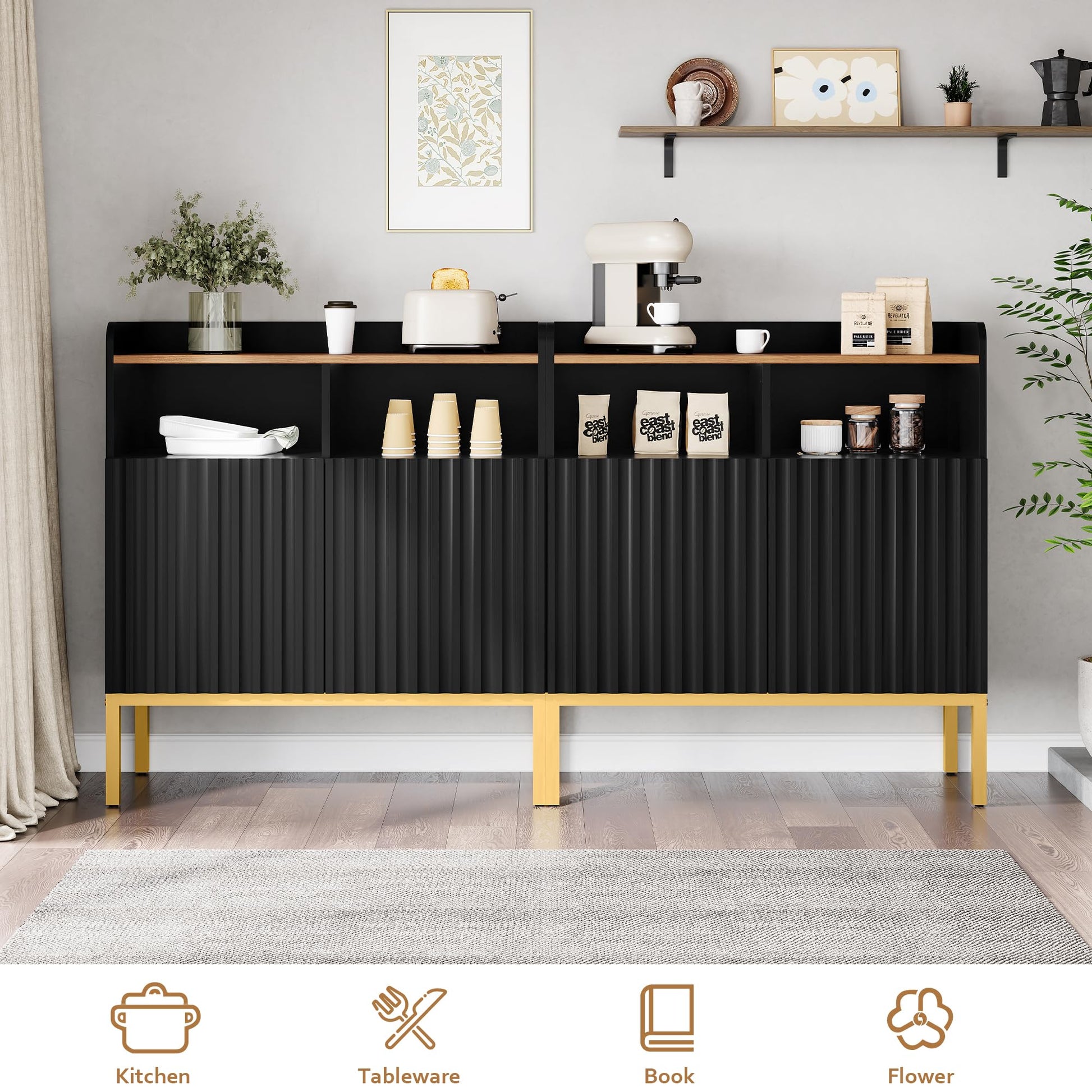 - A blend of black finishes, gold metal legs and thick fluted panels, this buffet cabinet has been crafted to seamlessly blend modern and farmhouse styles to create a bold visual experience of contrasting contrasts.