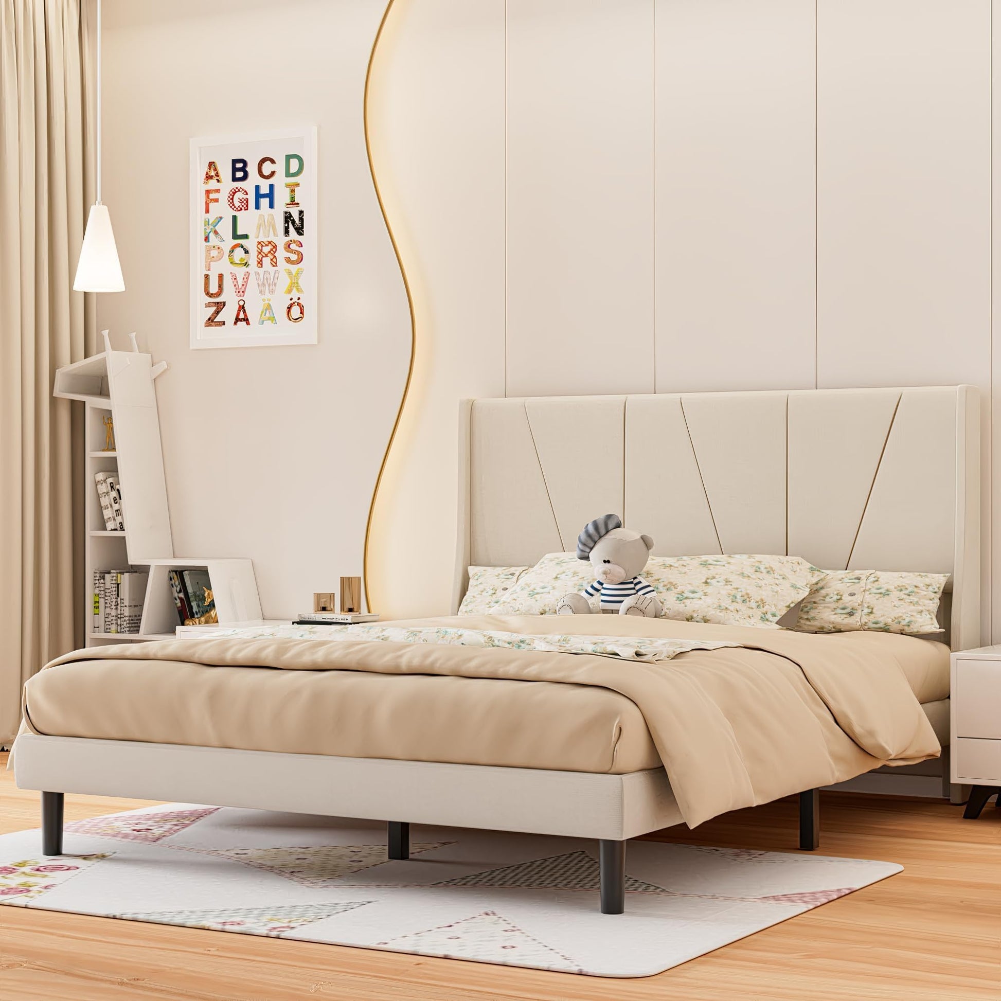 - The beige bed frame queen with wingback guards is designed in a modern style, which is well adapted to various bedroom decorations. The comfortable shape of the queen bed frame is suitable for daily use.