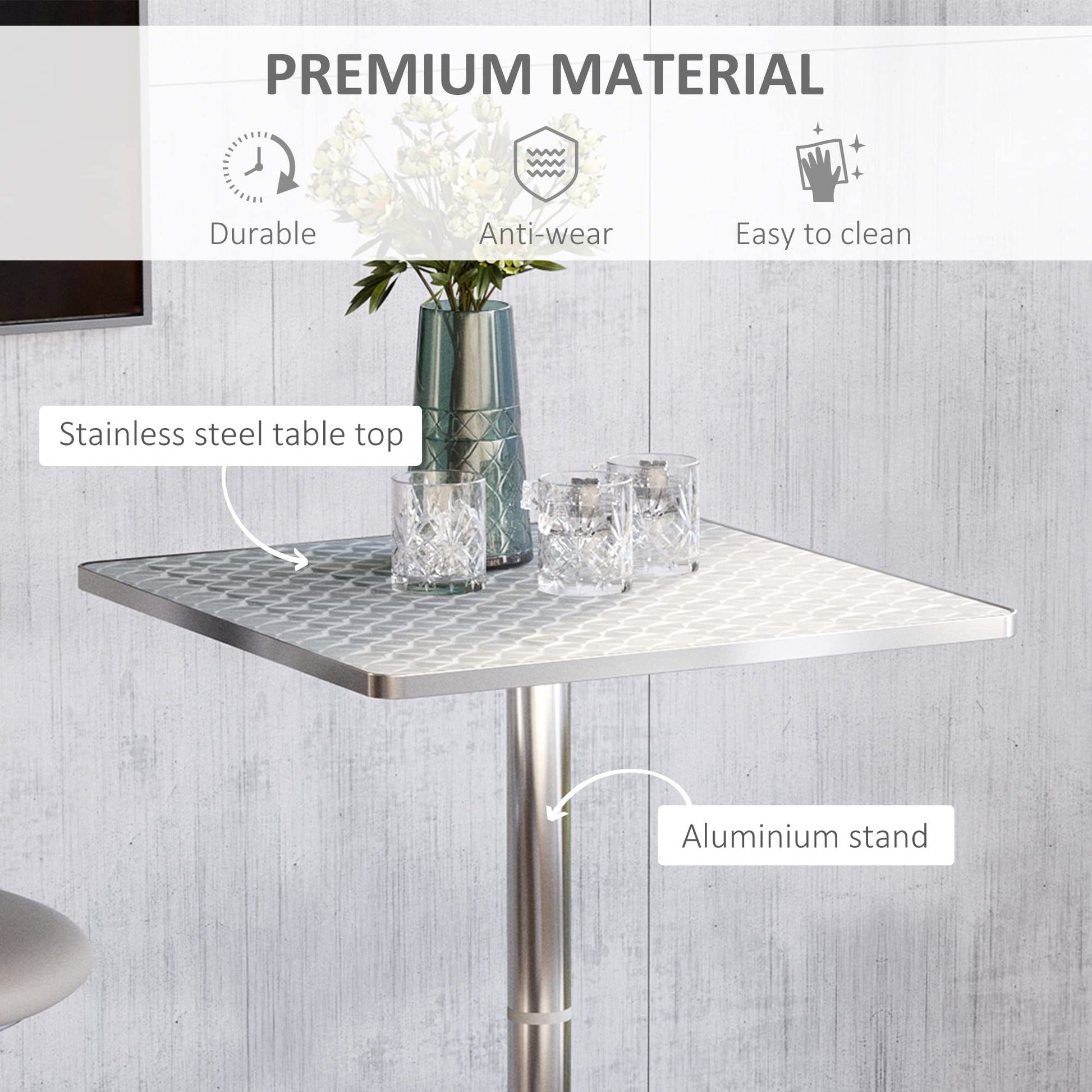 - A beautiful silver swirl finish adorns the top of this modern stainless steel and aluminum bar table creating an industrial chic style that is sure to complement any setting both indoor and outdoor.