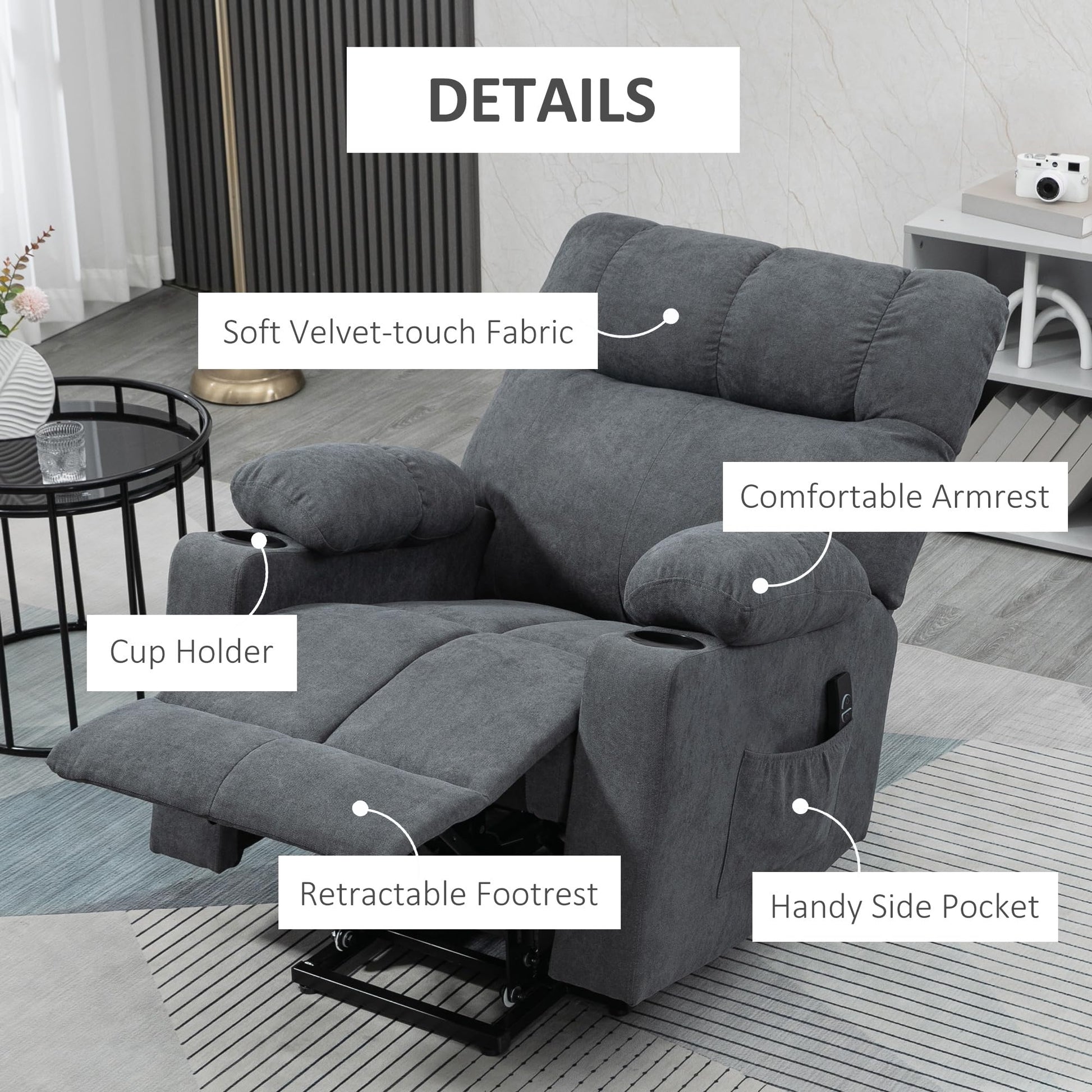 - Comfortable and Sturdy: Oversized design, upholstered in soft velvet-touch fabric and extra thick foam padding with a pocket spring system, our oversized recliner provides extraordinary comfort, stretchy and bounce to lay back and relax in. It's built from multi-layer board and solid steel with an anti-tipping counter-balanced lift mechanism, designed for big and tall.
