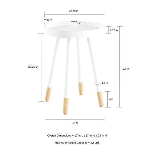 - WHITE SIDE TABLE – This round table features an updated mid-century modern design. The two-tone paint and natural wood finish, spindle-style legs, and round silhouette will bring a chic style to your living room, bedroom, office, or nursery.