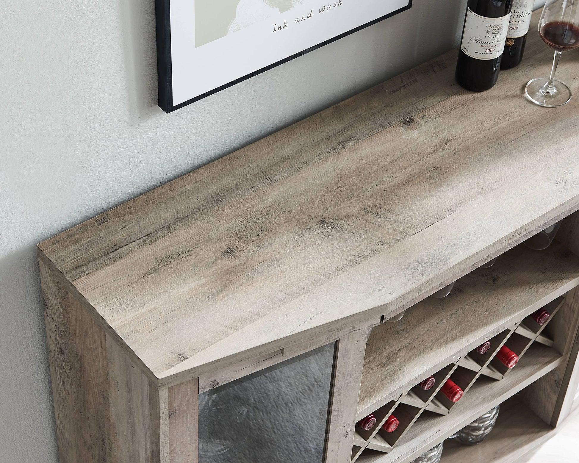- This unit has two cabinets with two curved glass doors with plenty of shelf space for wine glasses.