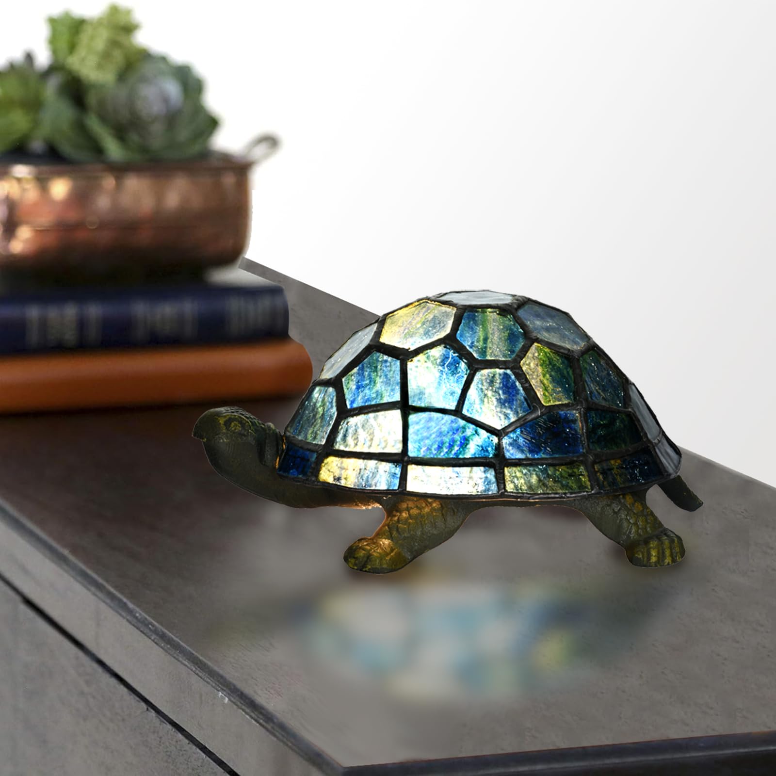 - DESIGN- This Tortoise accent lamp is made of stained glass shell in lovely blue hues, and metal body in antique bronze. It is very delicate and gives great ambiance, perfect little accent for corner that needs a little light!