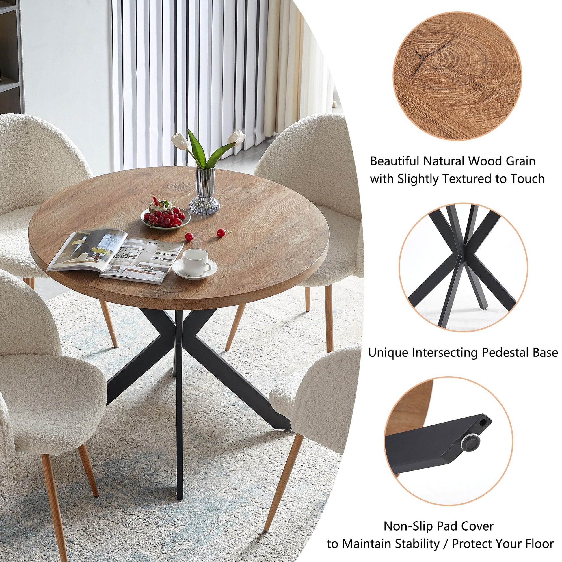 - This 5-piece dining table set includes a round table with a vivid imitation natural wood grain tabletop,and 4 fluffy faux fur armchairs with mid-back.Beautifully finished engineered wood tabletop with a stable intersecting pedestal metal base&legs design to provide a modern and chic atmosphere to your room and act as a central point. Non-slip legs cover add stability to keep this table set stable,also prevent floor or carpets from scratches.