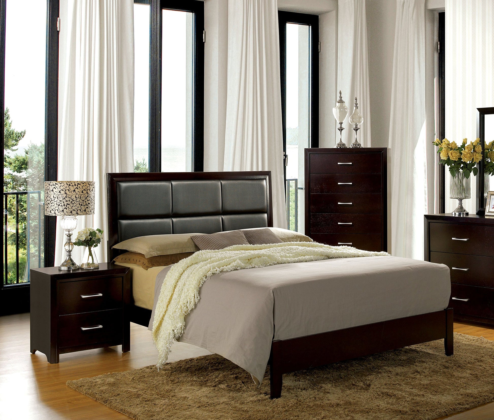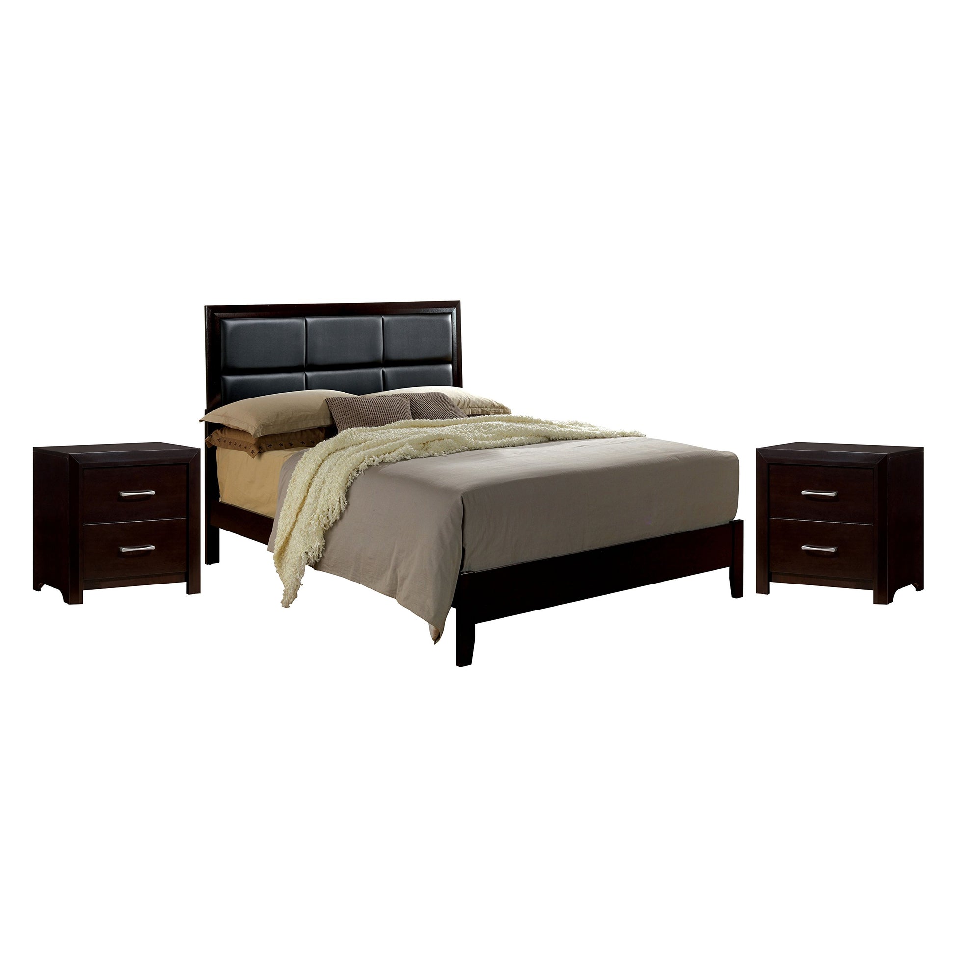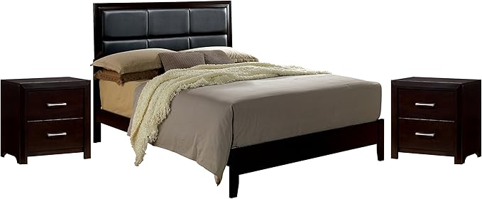 - Transitional style; Set includes (1) King-size Bed and (2) Nightstands; Espresso finish