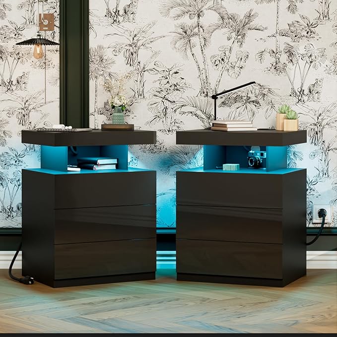 - This black nightstand designed with an open compartment and 3 sliding spacious drawers not only provide spacious concealed storage space but also help you classify a variety of items. Easy access and storage of your nighttime essentials.