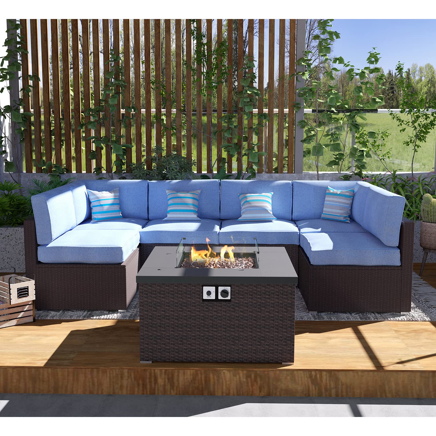 Outdoor 7 Pieces Sectional Sofa w Fire Table, Dark Brown Rattan Patio Furniture w 32-inch
