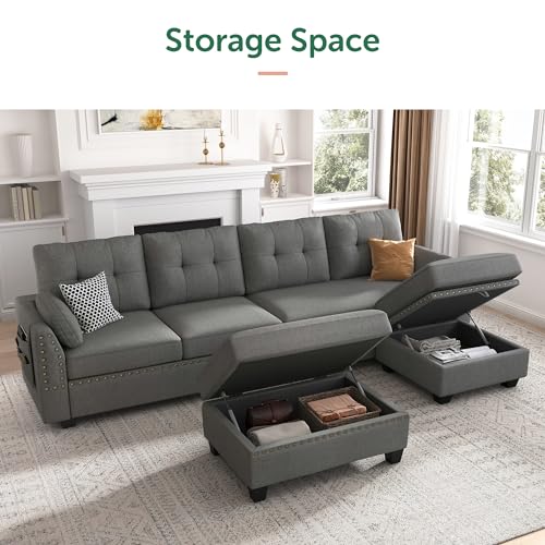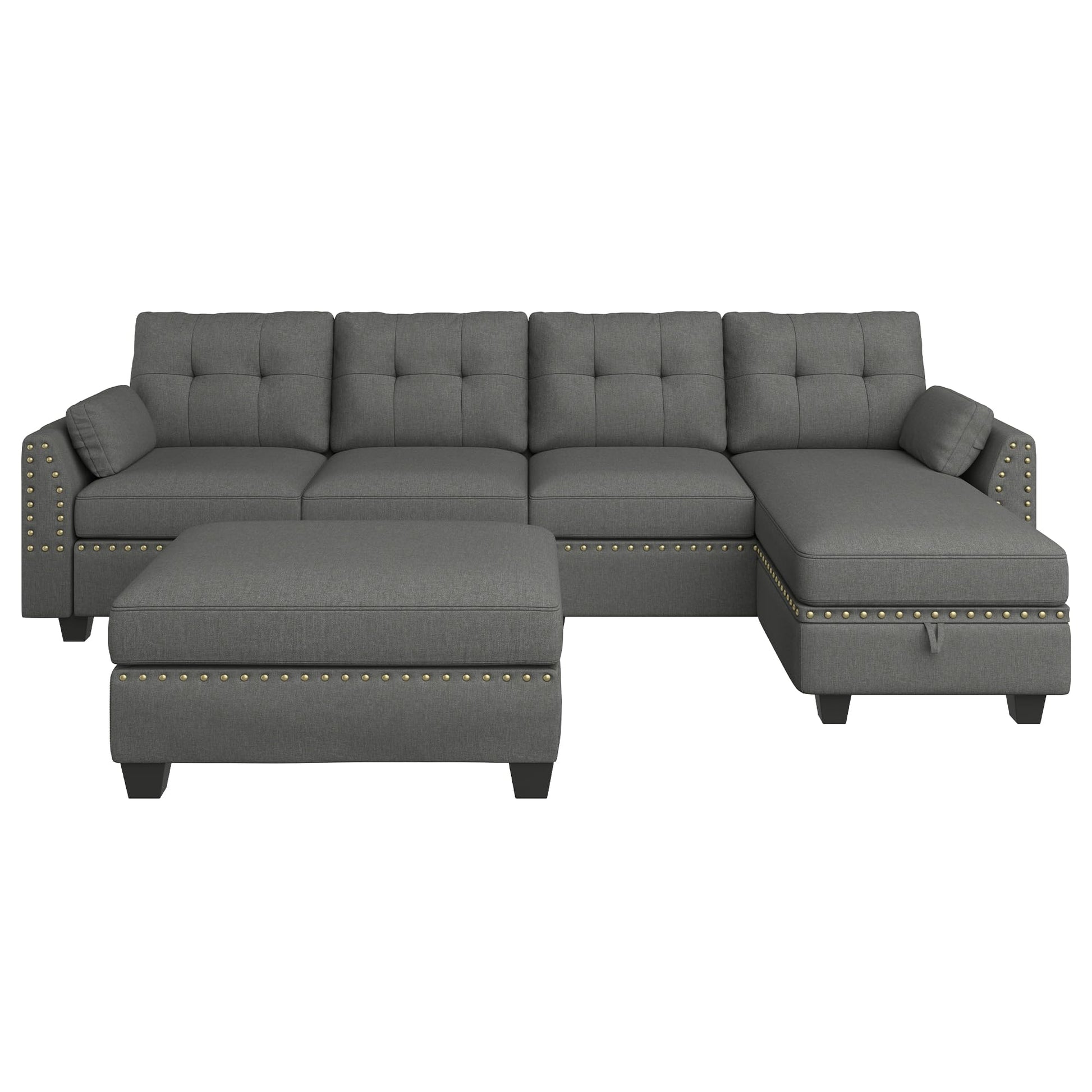 - Detail Design: The sectional sofa couch set is trimmed with nail head. The cushions also have hook and loop to keep them in place. Ottoman is a storage ottoman that can be opened and closed by hydraulic rod