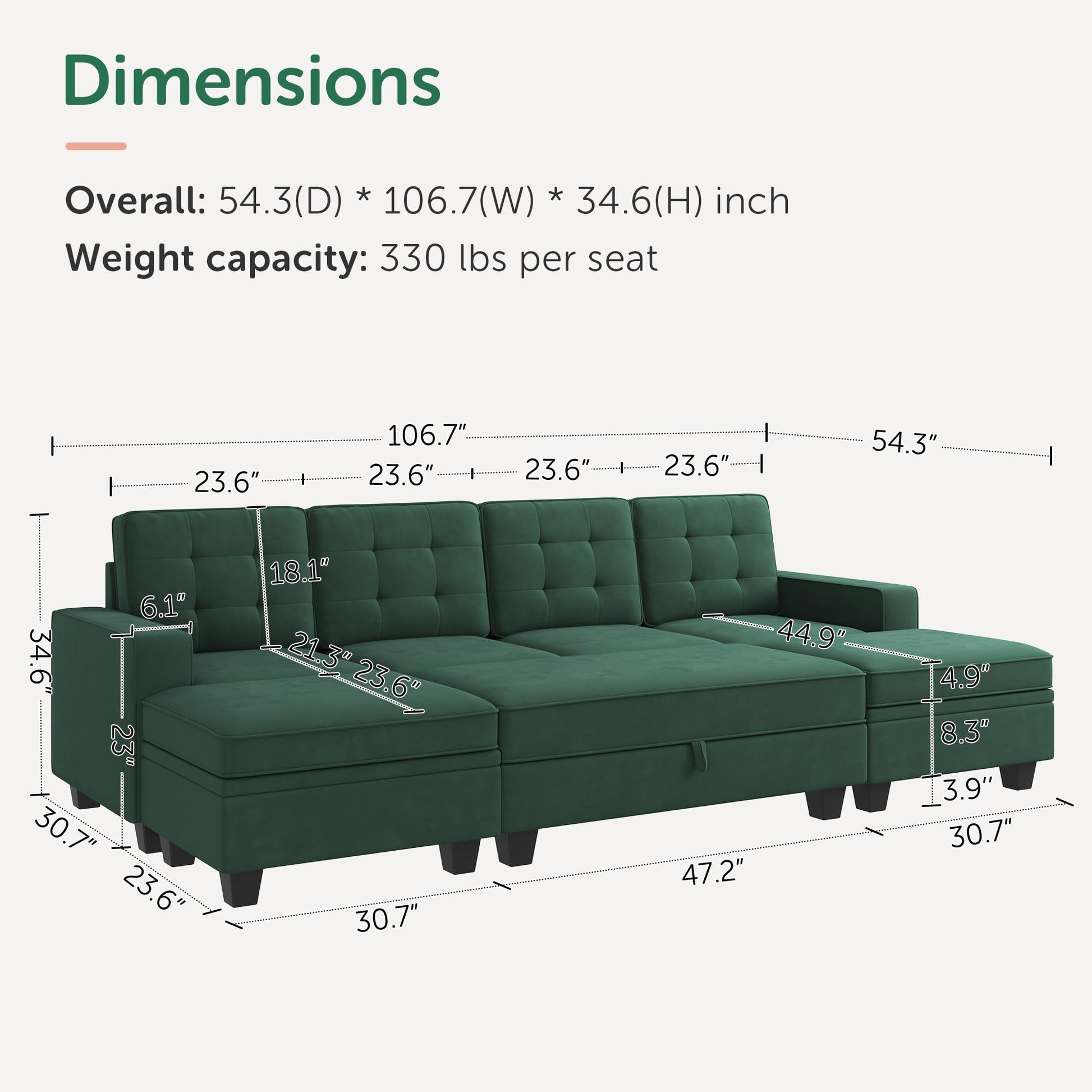 - Dimensions(D x W x H): 4-Seater Couch - 30.7 x 106.7 x 34.6 inches. Large Ottoman - 47.2 x 23.6 x 17.7 inches. Normal Ottoman - 30.7 x 23.6 x 17.7 inches