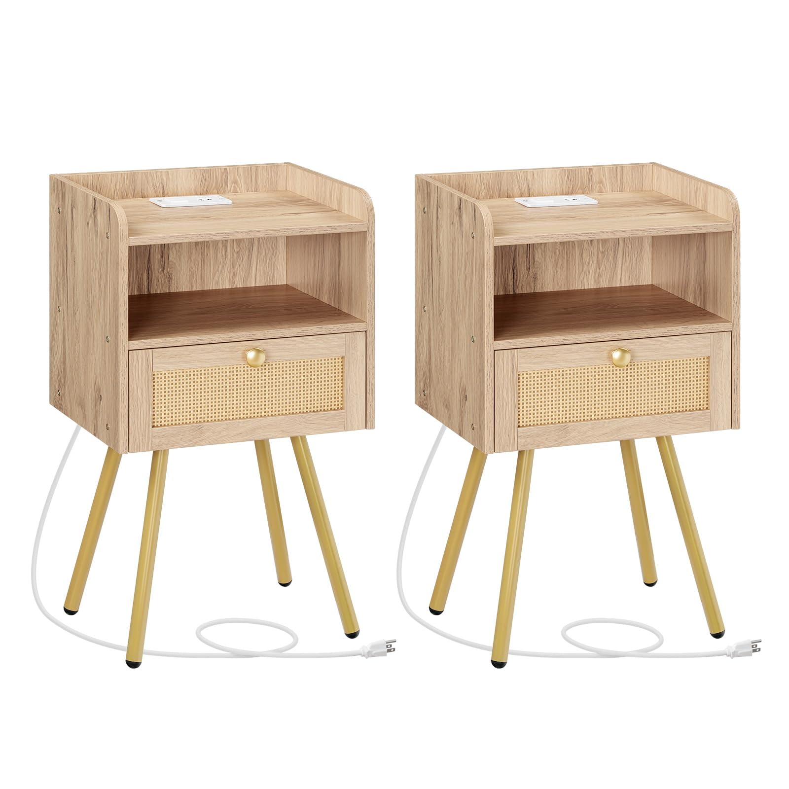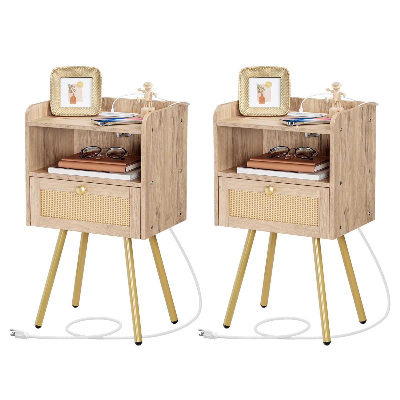 Nightstand with Charging Station, Set of 2, Side Table with Rattan-Like Decor