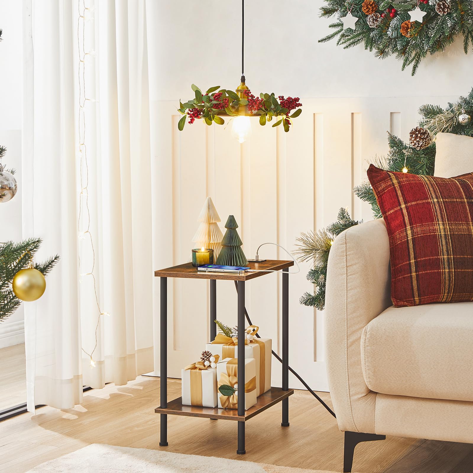- Side Table with Charging Station: Phone out of power at night? Inconvenient to turn on the light? Then this set of 2 2-tier side tables comes to help you out! With 4.9 feet long power cord, one 3-prong AC outlet and 2 USB ports, this side table offers you enough charging space for your electronic devices. Moreover, the simultaneous charging of your phone, tablet, desk lamp or laptop shall be a reality, no need for extra power strips