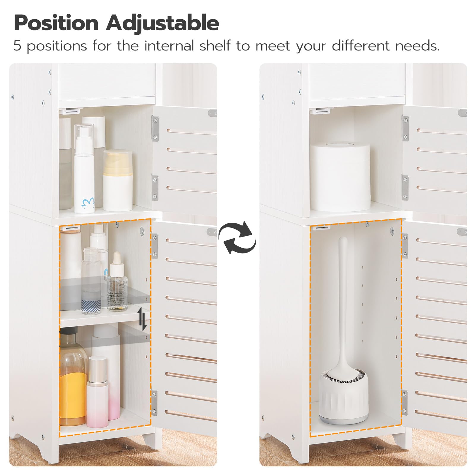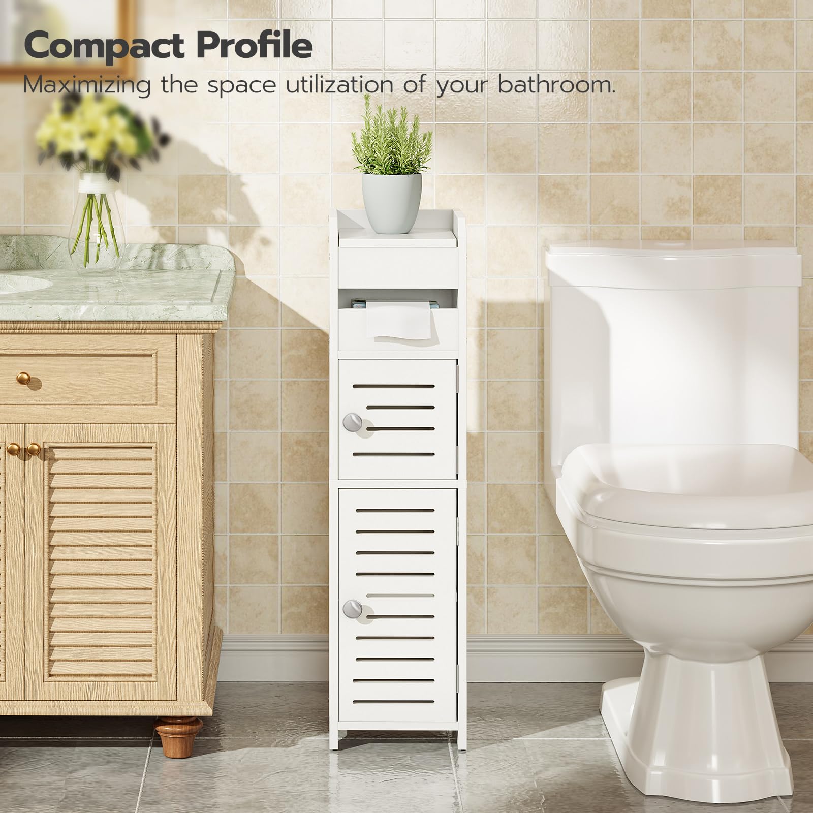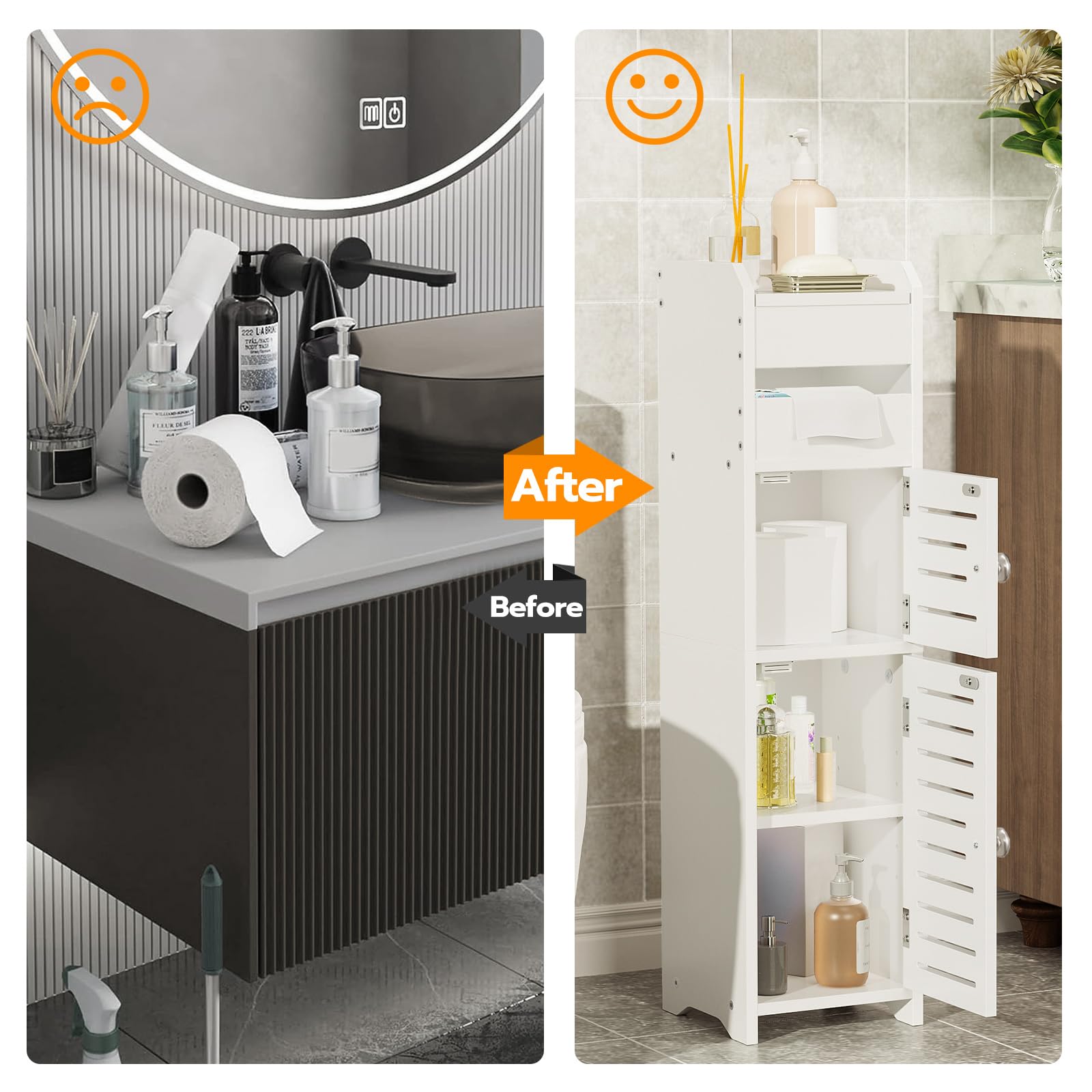 - Storage Space: The small bathroom storage comes with 2 open shelves, a semi-open toilet paper compartment and 2 hidden spaces with doors, giving you ample storage space. You can easily organize and categorize various bathroom supplies such as towels, toiletries, cosmetics, etc. These storage spaces can help you keep your bathroom tidy and organized, making your daily use more convenient