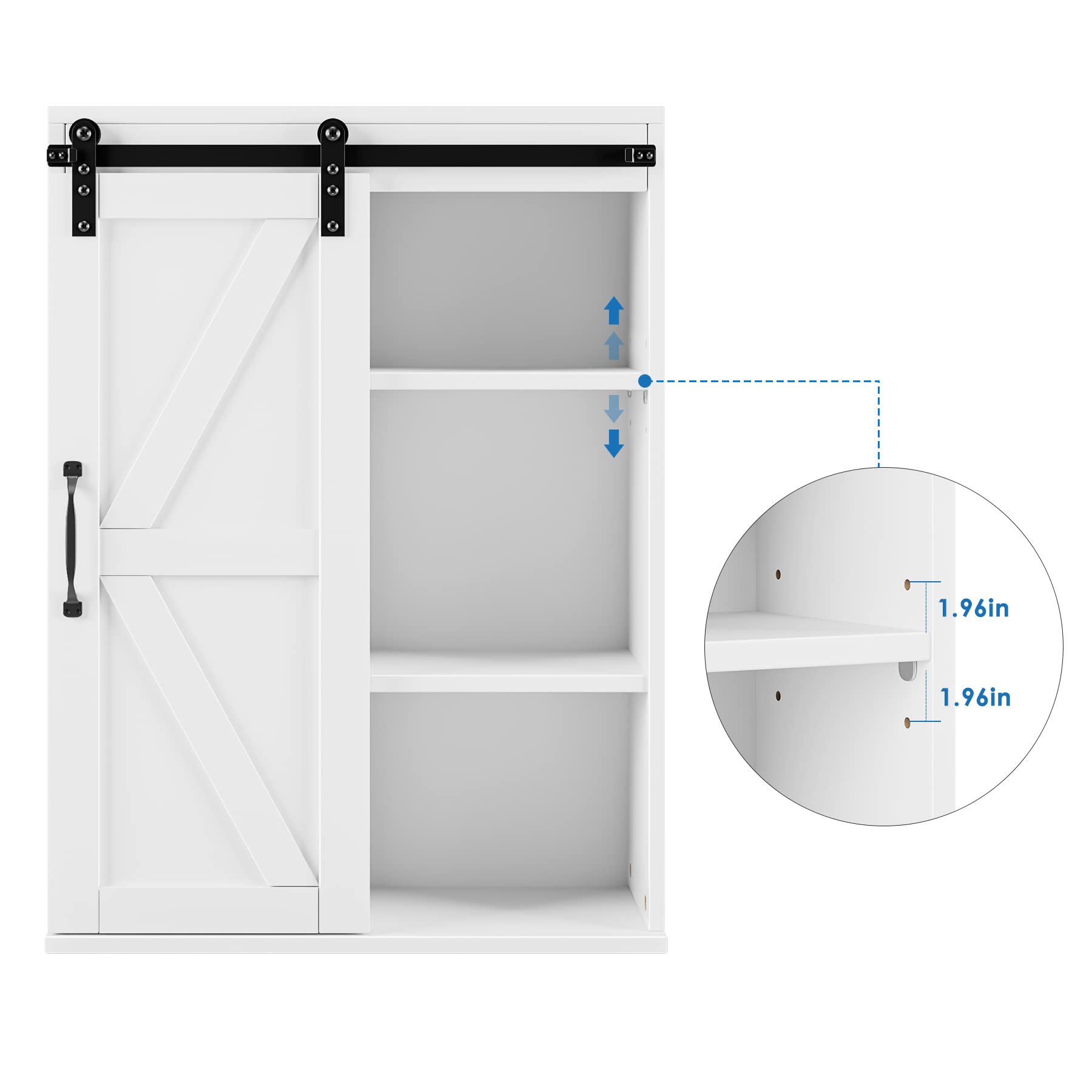 - The wall cabinet features 2 fixed shelves and 1 adjustable shelf to create flexible storage for your cosmetics, toiletries, towels, and toilet paper, while the sliding barn door design allows easy access and keeps the storage spaces tidy, organized and hidden from view